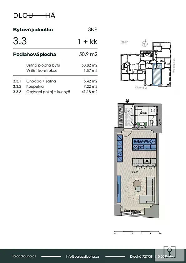 Nabízíme vám moderní a elegantní byt 1+kk o rozloze 50,9 m² v prestižním rezidenčním projektu Palác Dlouhá - jen pár kroků od Staroměstského náměstí. Dominantou bytu je velkorysý obytný prostor s kuchyňským koutem (41,18 m²), který díky vysokým stropům a velkým oknům působí mimořádně světlým a vzdušným dojmem. K dispozici je také praktická šatna, koupelna s elegantním designem a prostorná vstupní chodba. Byt se nachází ve 3. nadzemním podlaží noblesně zrekonstruovaného historického domu, který spojuje prvorepublikový šarm s moderními standardy bydlení. Lokalita? Jedna z nejlepších v Praze. V okolí najdete výběrové restaurace, kavárny, galerie i divadla. Perfektní dopravní dostupnost (metro, tramvaje) vás spojí se zbytkem města během několika minut. Byt je ideální pro stylové městské bydlení i jako investice s vysokým potenciálem zhodnocení.