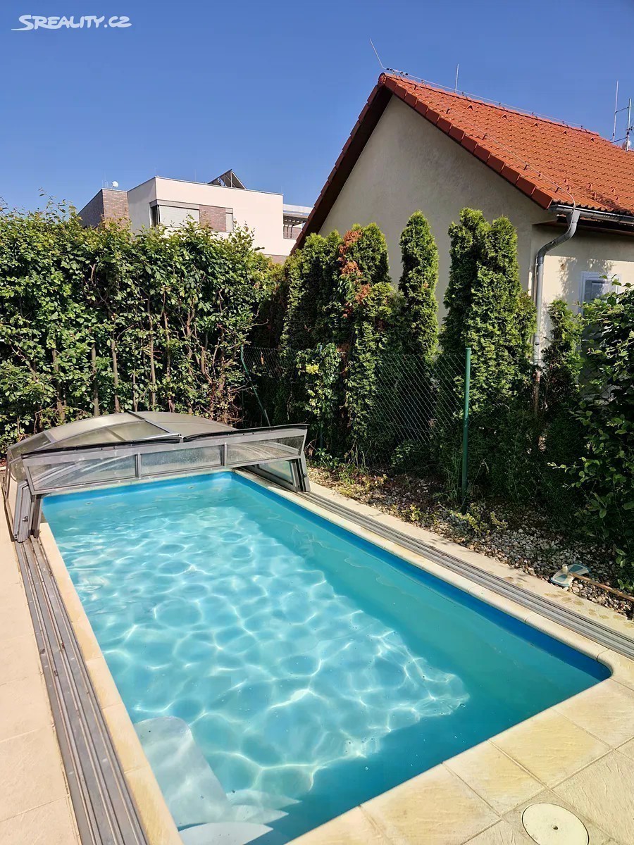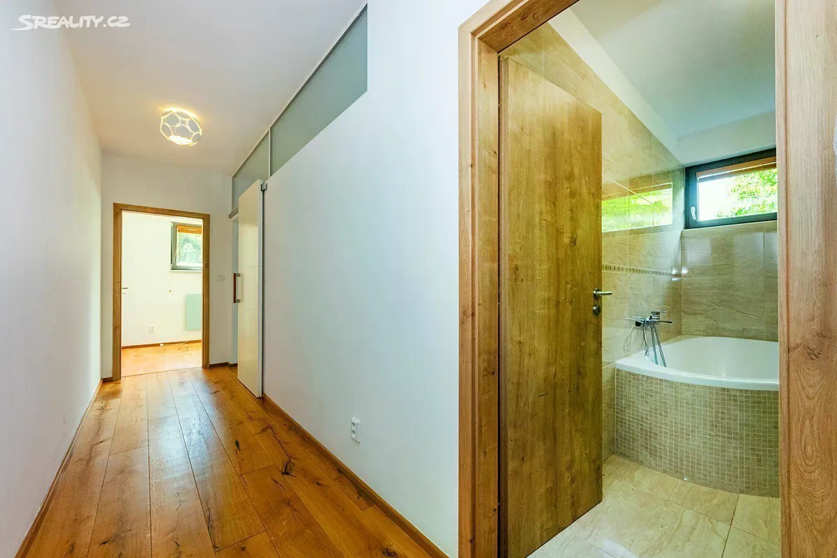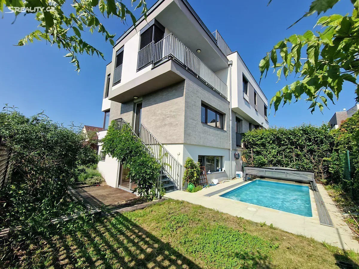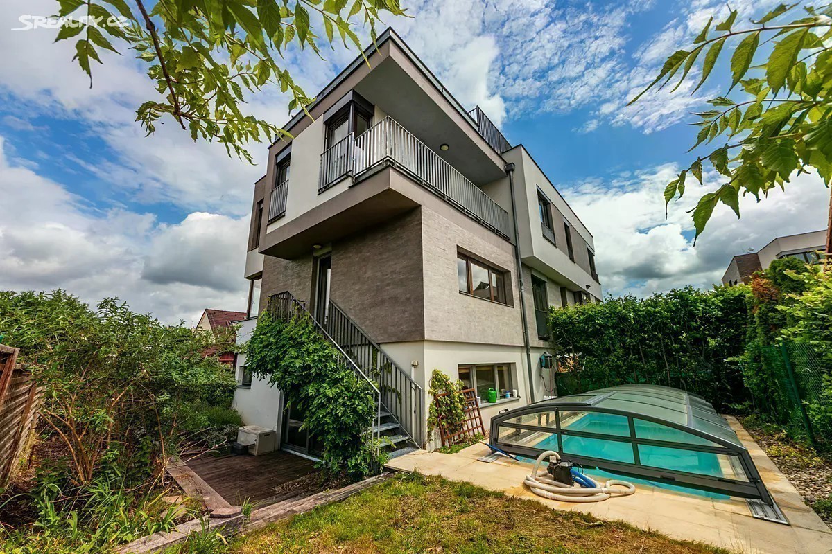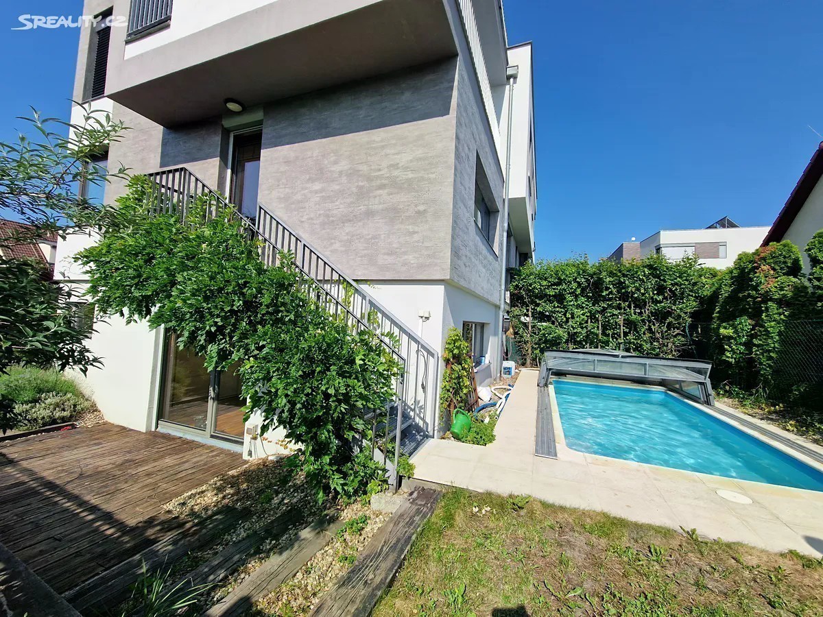 Prodej výjimečného bytu se soukromou zahradou a vyhřívaným bazénem v klidné části Prahy - Dolní Měcholupy. Nabízíme ke koupi exkluzivní byt s vlastní oplocenou zahradou a krytým vyhřívaným bazénem se slanou vodou, situovaný v prestižní rezidenční lokalitě Dolních Měcholup. Byt o celkové ploše 124,8 m² se rozkládá ve dvou podlažích moderního viladomu se čtyřmi jednotkami, umístěného v tiché ulici s rodinnými domy. Lokalita nabízí vysoký standard bydlení s důrazem na soukromí a klid. Dispozice 4+kk je aktuálně řešena následovně: v horním podlaží se nachází vstupní hala s elegantním schodištěm, prostorný a prosvětlený obývací pokoj s plně vybavenou kuchyňskou linkou, vestavěnou TV a přímým vstupem na zahradu. Dále zde najdete komfortní ložnici s vestavěnou skříní, koupelnu s nadstandardně velkým sprchovým koutem, samostatné WC a technickou místnost. Dolní podlaží nabízí dvě samostatné místnosti - jedna z nich má přímý vstup na zahradu a vestavěnou skříň. Dále je zde druhá koupelna s oknem, rohovou vanou a WC. Tento prostor lze snadno upravit dle individuálních potřeb. Byt je vybaven kvalitními materiály a technologiemi: dubové dřevěné podlahy, designové stmívatelné osvětlení značky Artemide, podlahové topení v koupelnách, podomítkové baterie Grohe a rekuperační jednotka. O bezpečnost se starají vstupní bezpečnostní dveře a elektricky ovládané předokenní rolety značky Almma. Zahrada o výměře 106 m² je plně oplocená a nabízí maximální soukromí. Dominantou je krytý a vyhřívaný bazén se slanou vodou, připravený k okamžitému využití - ideální pro relaxaci i společenská setkání. Součástí prodeje je také podíl na společné zahradě s trampolínou, parkovací místo ve dvojgaráži (s možností parkování druhého vozu před garáží nebo domem) a sklep s přístupem z garáže. Dolní Měcholupy jsou ideální lokalitou pro rodinné bydlení - nabízí dostatek zeleně, klidné prostředí, výbornou občanskou vybavenost a snadnou dostupnost do centra města. V okolí se nachází školy, sportoviště, přírodní parky i nákupní možnosti včetně obchodního centra Globus. Tato nemovitost je ideální volbou pro ty, kteří hledají komfortní a reprezentativní bydlení s důrazem na soukromí a kvalitu života.