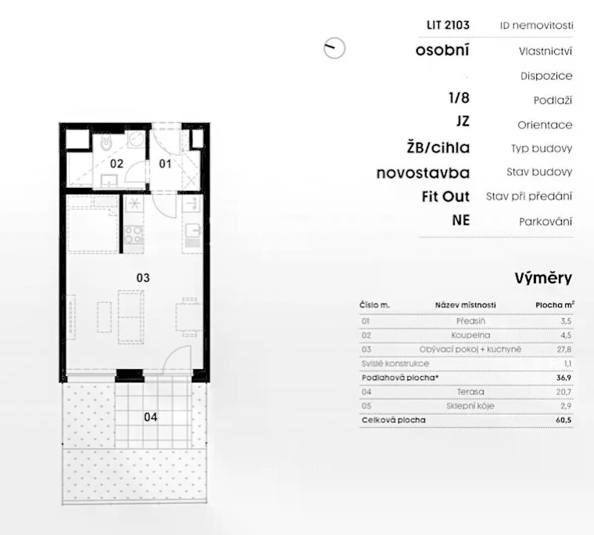 Moderní byt 1+kk s terasou a možností úpravy na 2+kk v oblíbené lokalitě Vršovice Hledáte místo, kde můžete začít novou životní kapitolu - nebo výhodně investovat? Nabízíme útulný byt 1+kk s velkorysou terasou v moderní novostavbě v srdci Vršovic. Byt se nachází v 1. nadzemním podlaží a díky své dispozici nabízí nejen komfortní bydlení, ale i možnost zajímavé úpravy. Základní informace: • Podlahová plocha bytu: 36,9 m² • Terasa: 20,7 m² • Sklepní kóje: 2,9 m² • Celková plocha: 60,5 m² • Orientace: jihozápad (JZ) • předává se ve standardu Fit Out Byt tvoří vstupní předsíň, koupelna se sprchovým koutem a prostorný obytný pokoj s kuchyňským koutem a přímým vstupem na soukromou terasu orientovanou do tichého vnitrobloku. Chytrá změna: 2+kk na dosah ruky Díky dvěma samostatným oknům nabízí byt možnost jednoduché a elegantní úpravy na dispozici 2+kk. Oddělením ložnicové a obývací zóny můžete vytvořit plnohodnotné dvoupokojové bydlení - ideální pro jednotlivce, pár nebo i jako chytrou investici k pronájmu. Přednosti projektu: Dům je součástí uzavřeného městského bloku s příjemným poloveřejným prostorem, který poskytuje klid i v centru města. Architektonické řešení klade důraz na moderní vzhled, funkčnost a komfort městského života. Nechybí praktické zázemí pro obyvatele domu, včetně místnosti pro kola. Lokalita: Vršovice patří mezi nejžádanější pražské čtvrti - a není se čemu divit. V bezprostředním okolí najdete stylové kavárny, oblíbené obchody, školy, školky, parky i zastávky MHD. Čtvrť vyniká svou autentickou atmosférou, komunitním duchem a skvělou dostupností do centra.* Předpokládaný termín nastěhování: do 12/2027