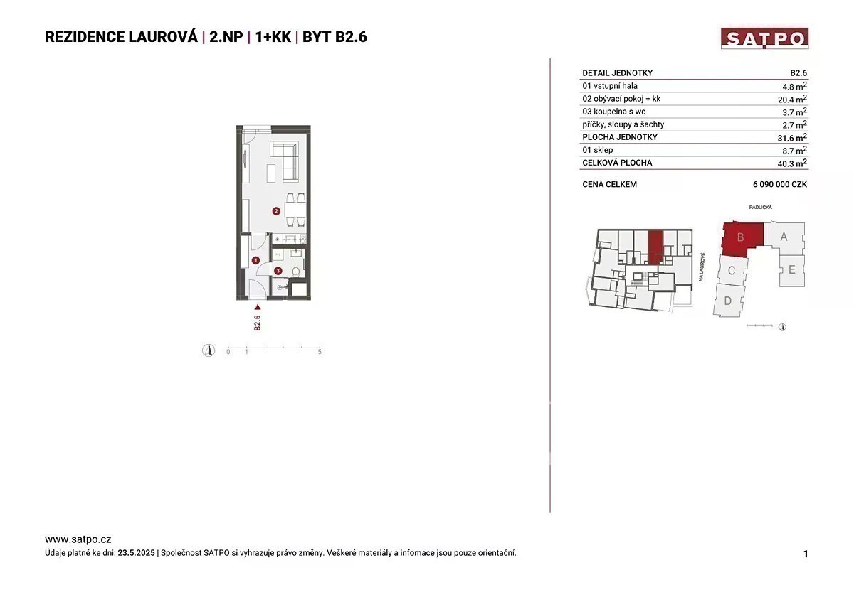 Hledáte výjimečný prostor, kde se snoubí velkoměstský styl s klidem a soukromím? Představujeme vám byt 1+kk o výměře 31,6 m2 s lodžií ve 2. NP moderní novostavby Rezidence Laurová v atraktivní lokalitě Prahy 5 - Smíchov. Celková užitná plocha bytu včetně sklepa je 40,3 m2. Elegantní bydlení, kde se budete probouzet s výhledem do zeleně, a přitom jen pár minut od centra. Architektonicky výjimečný dům s propracovanými detaily a službami na úrovni moderního městského života právě vzniká v lokalitě s duchem i perspektivou. Nabízí celkem 123 bytových jednotek s dispozicemi 1+kk až 5+kk a také 8 komerčních prostor. Nachází se mezi ulicemi Radlická a Na Laurové. Jedná se o jedinečnou a vyhledávanou oblast, kde se prolíná příroda, zázemí pro sport, nákupy i společenský život. Nabízí klidné prostředí pro relaxaci, přesto i vynikající dostupnost centra a dalších důležitých lokalit hlavního města. Už na jaře 2027 bude připravený vám zajistit nadčasové bydlení ve vysokém standardu. Byt i celý dům je v prémiovém standardu s důrazem na moderní technologie: - podlahové vytápění - rekuperace vzduchu - videotelefon, čipový vstupní systém - dřevěné podlahy a bezfalcové dveře o výšce 2,1 m - balkony a terasy s keramickou mrazuvzdornou dlažbou. Rezidence Laurová je privátním prostorem, který nabízí moderní životní styl pod jednou střechou. Součástí společných prostor je reprezentativní vstupní hala s recepcí 24/7, zasedací místnost pro soukromá jednání, prostor pro kočárky, kola a koloběžky a oplocený vnitroblok s parkovou úpravou. Na střeše domu je umístěna společná pobytová střešní zahrada SKY TOP se zelení, kuchyňkou a pergolou. Jste připraveni psát nový příběh na mimořádném místě? Napište nám! Rádi vás vaším novým domovem provedeme prostřednictvím virtuální reality.
