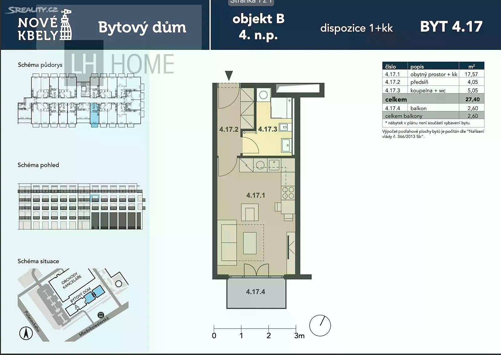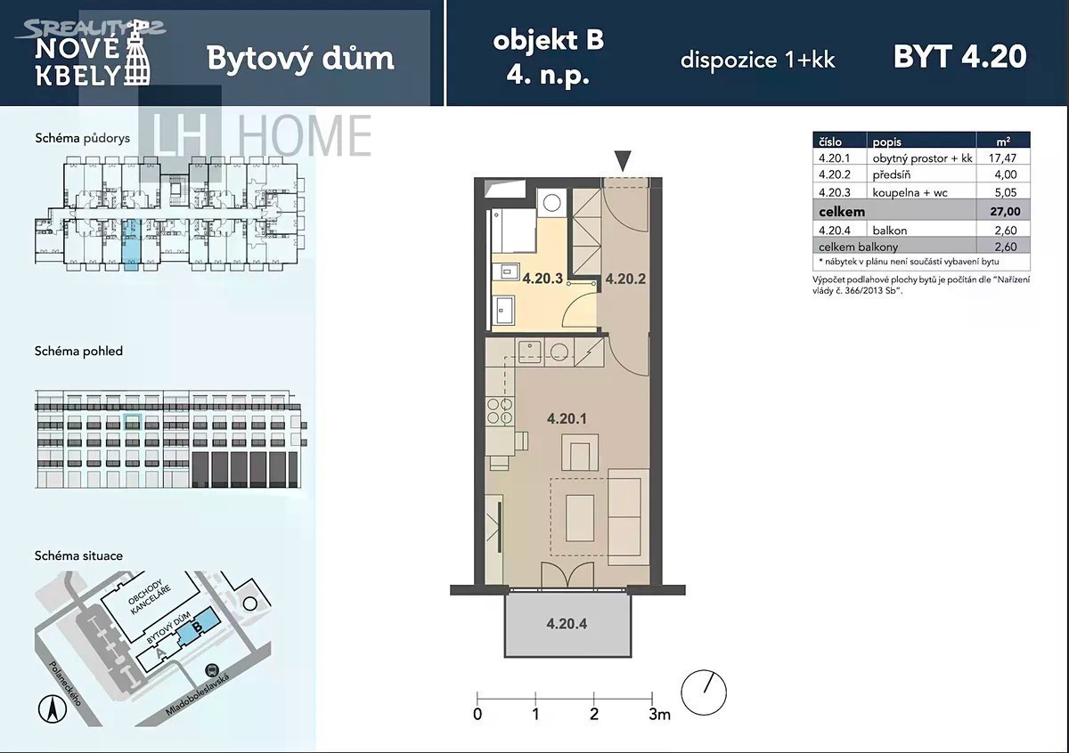 Nabízíme prodej nových bytů v projektu Nové Kbely v Mladoboleslavské ulici. V tomto krásném projektu naleznete širokou škálu nových bytů od 1+kk do 3+kk. K dispozici bude dostatek garážových stání a sklepů. Taktéž zde vzniknou komerční prostory a obchodní prostory. V blízkosti je kompletní infrastruktura: Obchody, parky, veřejná doprava, školy, školky, restaurace, obchod Billa, lékárna, aj. Byt 1+kk 27m2 (podlahové plochy)+ balkón o velikosti 2,6 m2 situovaný na jižní stranu. Byt se bude nacházet ve 4. podlaží. Součástí kupní ceny bytu jsou vinylové podlahy, interiérové dveře s obložkami, obklady a dlažby v koupelně a na wc, prostorný sprchový kout, skříňka s umyvadlem, zrcadlem a poličkou, wc, topný žebřík, videotelefon. Výstavba zahájena. Předpokládaný termín dokončený 1Q 2026. Nízké provozní náklady garantuje energetický štítek B. Prodej přímo od developera, všechny naše projekty si můžete prohlédnout na našich webových stránkách. Více informací na webových stránkách projektu.