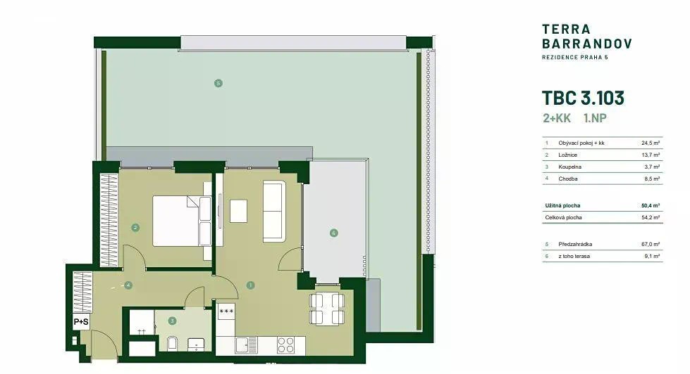 Terra Barrandov Praha 5, ulice Silurská 2+kk 55,5 m2 s předzahrádkou 48,2 m2 v 2. patře Orientace bytu: V Nabízíme moderní byt 2+kk v 2. patře prestižního projektu Terra Barrandov. Tento prostorný byt s praktickým uspořádáním a vysokým standardem nabízí ideální prostředí pro komfortní život. Dispozice zahrnuje velký obývací pokoj s kuchyňským koutem a ložnici z obou je vstup na předzahrádku. Koupelna je zařízena vanou a toaletou. Je zde předsíň s dostatkem úložných prostor. K bytu náleží sklepní kóje. Možnost dokoupení garážového stání. Součástí bytu jsou technologické prvky, které výrazně zvyšují komfort bydlení a zároveň přispívají k energetické úspornost: podlahové vytápění, systém dochlazování a řízené větrání s rekuperací. Tyto standardy zajišťují příjemné vnitřní klima během celého roku a nižší provozní náklady. Byt je navržen s důrazem na funkčnost a každodenní pohodlí, nechybí kvalitní materiály, dostatek denního světla, ani promyšlené dispoziční řešení. Projekt Terra Barrandov nabízí nejen moderní bydlení, ale také prostředí podporující komunitní život. Obyvatelé mohou využívat sdílené prvky, jako je komunitní zahrada se skleníkem, klubovna, dětské hřiště nebo místo na grilování. Obyvatelé mají navíc k dispozici společnou střešní terasu. Projekt je rozvržen do několika objektů, což přispívá k většímu soukromí, klidné atmosféře a příležitostem ke komunitnímu setkávání. Lokalita Silurské ulice na Barrandově nabízí výbornou dostupnost do centra Prahy, pouhých 8 minut MHD, a zároveň přírodu doslova za rohem. V okolí najdete mateřskou i základní školu, obchody, lékárnu, kavárny, hřiště i několik zastávek tramvaje a autobusu. Milovníci přírody ocení blízkost Chuchelského háje s Mariánským pramenem nebo vyhledávaného Prokopského údolí, ideálního pro běh, procházky i cyklistiku. Nabídka je vhodná pro všechny, jak pro páry, rodiny s dětmi, ale i jako investiční nemovitost pro dlouhodobý pronájem. Díky spojení praktické dispozice, kvalitního provedení, šetrných technologií a atraktivní lokality jde o zajímavou příležitost s dlouhodobou hodnotou. V případě zájmu nás neváhejte kontaktovat a navštivte klientské centrum developera JRD, kde již brzy bude možné využít virtuální prohlídku a vzorkovnu nabízených standardů. V nabídce je celkem 225 bytů různých velikostí od 1+kk po 4+kk, které jsou navrženy tak, aby vyhovovaly rozmanitým potřebám budoucích obyvatel.