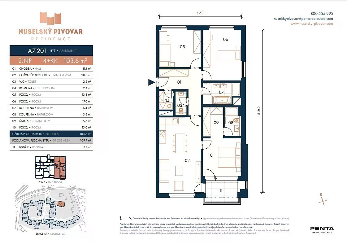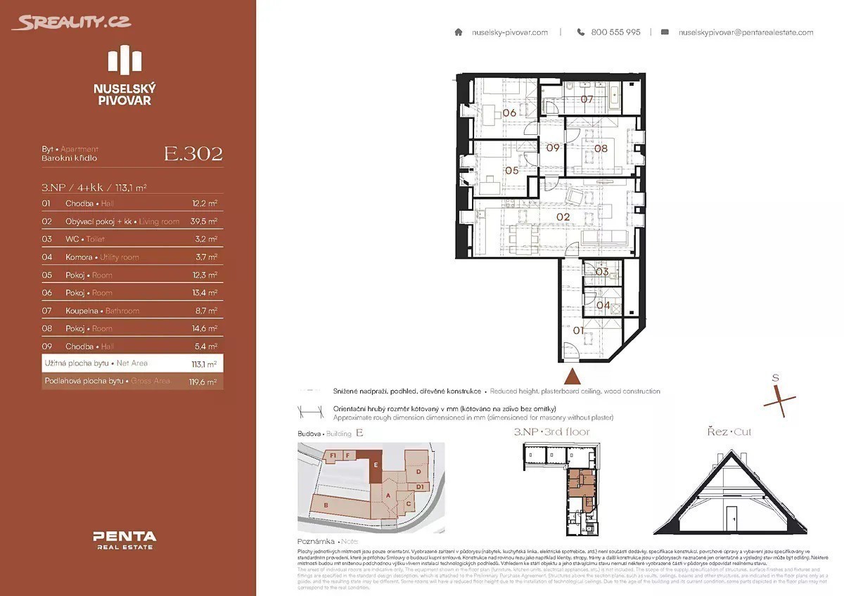 Nový byt č. E.302 o dispozici 4+kk (113,1 m2) se nachází ve 3. nadzemním podlaží budovy E v projektu Nuselský pivovar Lofty. Provedení bytu ve vysokém standardu Premium nabízí např. celoplošně lepenou dřevěnou podlahu v obytných místnostech, lakované interiérové dveře, koupelnu s velkoformátovými keramickými obklady a prémiovými zařizovacími předměty. Součástí vybavení koupelny je také elektrické podlahové přitápění a žebříčkový radiátor. Byt je dále vybaven přípravou pro klimatizaci ve všech obytných místnostech. K bytu je nutné zakoupit parkovací stání a sklep. Orientační ceny jsou stanoveny pro parkovací stání na 672 000 Kč a pro sklep 200 000 Kč včetně DPH, vždy v závislosti na velikosti a umístění. Více informací u prodejce. Developerský projekt Nuselský pivovar od společnosti Penta Real Estate se nachází na úpatí Vinohrad v areálu bývalého pivovaru. Celé území na ploše téměř 32 tisíc m2 prošlo citlivou revitalizací. Vyrostlo zde více než 400 nových bytů v nové rezidenční výstavbě a zrekonstruovaném historickém pivovaru. Moderní prostory určené pro obchody a služby jsou k dispozici nejen v rámci rekonstrukce historického pivovaru, ale i v přízemních podlažích rezidenčních domů v těsné blízkosti pěší zóny a pivovarského náměstí. Obchodní pasáž, procházející historickou budovou, nově propojí Křesomyslovu ulici s klidným pivovarským náměstím bez ruchu dopravy, a nabídne široké spektrum služeb. Byty v budovách A-F1 mají plánovaný termín dokončení Q2/2025, k nastěhování budou připravené půl roku od dokončení. Více informací o projektu a lokalitě naleznete na webových stránkách projektu.