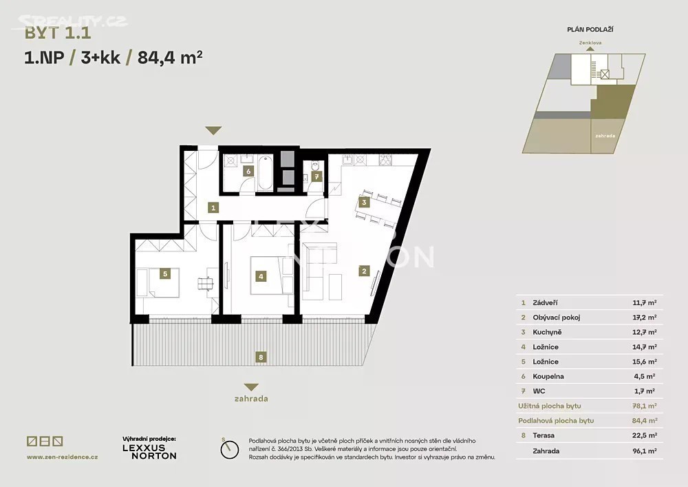 Nabízíme jedinečný byt 3+kk o celkové ploše 88,9 m², který se nachází ve druhém nadzemním podlaží nového rezidenčního projektu ZEN Rezidence v atraktivní lokalitě pražské Libně. Tento byt s promyšlenou dispozicí a prostornou lodžií (5,3 m²) orientovanou do klidného vnitrobloku je ideálním místem pro rodinné bydlení. Byt vás přivítá vstupní chodbou (15,7 m²) s dostatkem místa pro úložné prostory, která plynule přechází do hlavní obytné části. Tuto část tvoří prostorný obývací pokoj spojený s kuchyňským i jídelním koutem (28,4 m²) a přímým vstupem na lodžii, která je ideálním místem pro odpočinek. Na opačné straně chodby navazují dvě ložnice (15,5 m² a 15,3 m²), které nabízejí dostatek prostoru pro šatní skříně. K pohodlí bytu přispívá také koupelna s vanou a samostatná toaleta. Dokončení bytu ve vysokém standardu zahrnuje vinylové podlahy v dekoru dřeva, prémiové velkoformátové obklady a vybavení renomovaných značek SAT a GROHE. Hliníkové izolační okna s trojskly zajišťují dokonalou tepelnou i zvukovou izolaci, zatímco elektrické venkovní žaluzie a řízené větrání s rekuperací tepla přispívají ke komfortu bydlení. Bezpečnostní vstupní dveře třídy 3 poskytují maximální bezpečí. K bytu náleží parkovací stání a sklepní kóje v podzemních podlažích. ZEN Rezidence představuje unikátní projekt, který kombinuje moderní architekturu, funkčnost a pohodlí pro nadstandardní bydlení. Rezidence disponuje reprezentativními společnými prostory, kočárkárnou a zázemím pro mytí kol, což přispívá k vyššímu komfortu budoucích rezidentů. Libeň je ideální čtvrtí pro ty, kteří hledají výbornou dostupnost centra města a zároveň klidné prostředí. Stanice metra Palmovka a tramvajové linky vás do 10 minut dopraví do srdce Prahy. V okolí rezidence najdete kompletní občanskou vybavenost - školy, školky, Fakultní nemocnici Bulovka, sportovní centra, restaurace, kavárny i obchody. Milovníci přírody ocení blízkost parku Pod Korábem, Proseckých skal či kouzelných procházek podél Vltavského nábřeží. Pokud hledáte moderní bydlení v atraktivní lokalitě, ZEN Rezidence je tou pravou volbou.