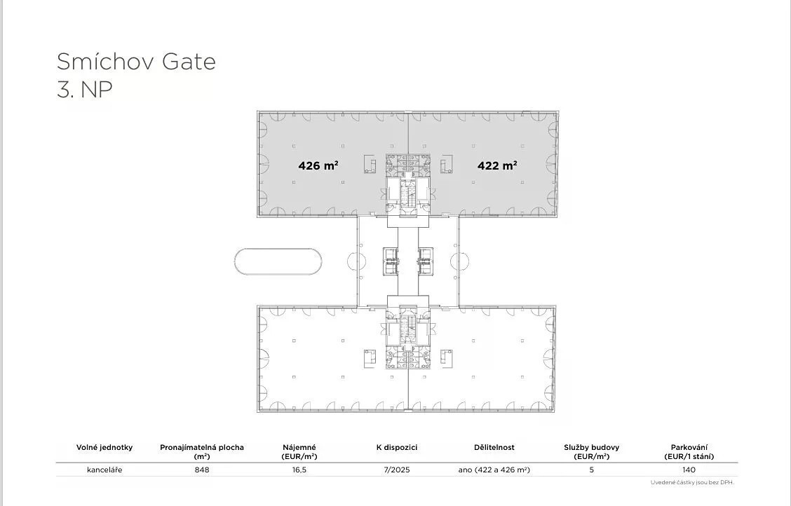 Administrativní objekt Smíchov Gate se nachází v prestižní obchodní lokalitě Prahy 5 na Andělu, přímo u výjezdu ze Strahovského tunelu. Největší předností této oblasti je vynikající dostupnost městskou hromadnou dopravou - stanice metra Anděl (trasa B), několik tramvajových linek, Smíchovské nádraží a významné autobusové nádraží jsou v bezprostřední blízkosti. Díky přímému napojení na dálnici D5, výborné infrastruktuře a snadné dosažitelnosti letiště (cca 15 minut jízdy autem) patří Anděl mezi nejžádanější obchodní čtvrti v Praze. Budova má tvar písmene H, což umožňuje maximální efektivitu využití prostor. Je vybavena moderními technologiemi, reprezentativním lobby a splňuje nejvyšší mezinárodní standardy včetně certifikátu BREEAM. Nájemcům nabízí dostatek podzemních parkovacích míst, čímž zajišťuje maximální komfort. Dostupné jednotky k pronájmu: 2. NP - Kancelářské prostory 413 m² cena: 16,5 EUR/m² služby: 5 EUR/m² parkování: 140 EUR/místo dostupnost: ihned 3. NP - Kancelářské prostory 848 m² cena: 16,5 EUR/m² služby: 5 EUR/m² parkování: 140 EUR/místo dostupnost: 7/2025. Dělitelnost: ano (možnost rozdělení na 422 m² a 426 m²). Pro bližší informace a prohlídku mě neváhejte kontaktovat.