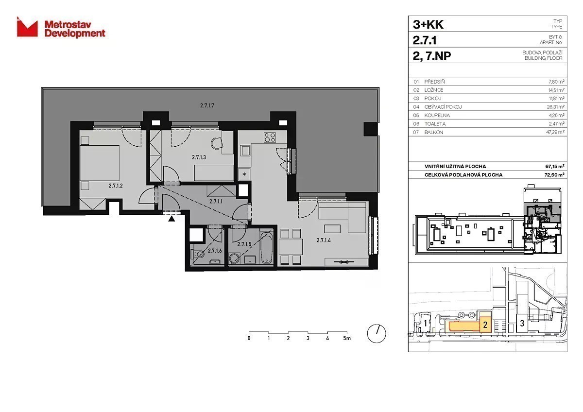 Prodej bytu 3+kk, 72,5 m² + terasa 47 m² - Praha 5, Barrandov Nabízíme ke koupi moderní byt o dispozici 3+kk o podlahové ploše 72,5 m², který se nachází v 7. nadzemním podlaží nově vznikajícího rezidenčního projektu v atraktivní lokalitě Prahy 5 - Barrandov. K bytu náleží mimořádně prostorná terasa o výměře 47 m², což nabízí nadstandardní venkovní prostor pro relaxaci i společenské aktivity. Byt je situován v nejvyšším patře s dostatkem denního světla, soukromí a příjemnými výhledy. Celý projekt je navržen v duchu současné architektury s důrazem na kvalitní materiály, energetickou efektivitu a komfortní bydlení. Základní informace: Dispozice: 3+kk Podlahová plocha bytu: 72,5 m² Terasa: 47 m² Balkon: 2,6 m² Podlaží: 7. NP Osobní vlastnictví Výtah v domě Plánované nastěhování: 2Q 2026 K bytu je nutné přikoupit garážové stání za cenu 540 000 Kč. Součástí prodeje je zajištění kompletního realitního a právního servisu včetně individuálního přístupu a koordinace celého procesu koupě. Kupní cena bytu: 12 650 000 Kč + garážové stání V případě zájmu o více informací či sjednání osobní schůzky nás neváhejte kontaktovat. Rádi vám poskytneme veškerou dokumentaci a odpovíme na vaše dotazy.