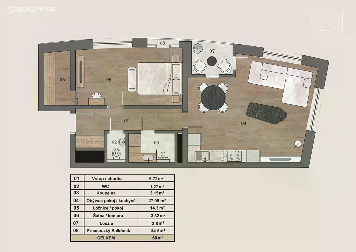 Vítejte ve vašem novém domově! Kombinace progresivní architektury s přírodou, dech beroucími výhledy na řeku Vltavu a s městským životem na dosah ruky. To je Rezidence Marina Zbraslav. Bydlení, které si zamiluje každý. Komorní velikost projektu znamená bezpečí vašeho domova. Respektujeme rozdíl mezi rezidencí a sídlištěm. Rezidence Marina Zbraslav je místem, kde bychom sami chtěli bydlet. První bytový dům nabídne 9 bytů, druhý 14 a třetí 18. Vjezd bude umožněn pouze vozidlům s registrovanou SPZ, společné prostory včetně zahrad a hřiště zabezpečeny. Pocit soukromí a bezpečí domova je pro nás prioritou. Budoucí podoba je inspirována kulturou bydlení na březích řek a jezer ve Švýcarsku, a severní Itálii s propojením na funkční místa sportovního a společenského života. Vše navrženo s důrazem na kvalitu a komfort bydlení. Tento unikátní projekt vzniká pod taktovkou developerské společnosti Pro Construction s.r.o. a ve spolupráci s Vivienne Construction a.s. Lokalita: Projekt se nachází na křižovatce ulic Žitavského a K Přehradám. Tento byt nabízí nadstandardní bydlení s důrazem na detail a uspokojí i ty nejnáročnější požadavky. Představuje dokonalou kombinaci elegance, praktičnosti a komfortu. Dominantou bytu je světlý obývací pokoj s kuchyňským koutem ( 27,05m²), který propojuje moderní design s jednoduchostí a funkčností. Z této místnosti je přímý vstup na útulnou lodžii ( 3,6m²), která je ideálním místem pro privátní relaxaci u ranní kávy nebo večerní pohodu nad sklenkou vína. Ložnice (14,3m² ) poskytuje klidné útočiště a je přímo propojena s prostornou šatnou (3,32m²). z ložnice také vede vstup na elegantní francouzský balkonek poskytující neopakovatelné ranní výhledy. Byt je na vržen s důrazem na energetickou úspornost a pohodlí. Velkoformátová okna stroj skly přinášejí dostatek přirozeného světla, zatímco podlahové vytápění zajišťuje příjemnou teplotu. rekuperační systém pak garantuje stálý přísun čerstvého vzduchu bez pachů, alergenů a pylů. Stropy s nadstandardní výškou 280cm poskytují luxusní prosvětlení a pocit vzdušnosti tohoto interiéru. Po vstupu do jednotky vás uvítá předsíň (6,72 m²), která nabízí prostor pro velkou vestavěnou skříň v zádveří. Z předsíně je přístup do prostorné koupelny (3,15m²),na samostatně umístěnou toaletu (1,27m²) a do hlavní obytné části. Součástí objektu je moderní parkovací zázemí s garážovými stáními.