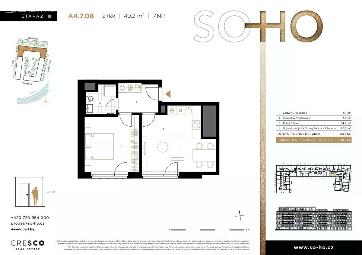 Světlý byt s klimatizací o dispozici 2+kk (49,2 m²) s orientací na jih do klidného zeleného vnitrobloku se nachází v 7. nadzemním podlaží moderní novostavby 2. etapy SO-HO Rezidence, v atraktivní lokalitě jižních Holešovic. Tento zajímavě řešený byt nabízí vzdušný obývací pokoj propojený s jídelnou a kuchyní, což vytváří ideální zónu pro odpočinek i společenské aktivity. Byt vyniká moderním designem od renomovaného architektonického studia QARTA Architektura, které klade důraz na kvalitu, funkčnost a precizní detaily. Interiér je vybaven prémiovým standardem: klimatizací, dřevěnými celoplošně lepenými podlahami, podlahovým topením, bezfalcovými dveřmi s výškou 2,1 m, velkoformátovými hliníkovými okny s izolačním trojsklem a elektricky ovládanými předokenními screenovými roletami. K bezpečnosti přispívají vstupní dveře 3. bezpečnostní třídy. V koupelně najdete velkoformátové obklady a dlažby a podomítkové baterie. Na přání je možné vybavení bytu nebo jeho dispozici individuálně přizpůsobit v rámci klientských změn. SO-HO Rezidence se nachází v dynamické části Holešovic, která nabízí nejen kvalitní bydlení, ale i širokou občanskou vybavenost. Okolí láká množstvím gastronomických podniků, kaváren, kulturních a uměleckých aktivit - DOX, současné umění, divadelní scény a moderní street art. Milovníci přírody ocení nedalekou Stromovku pro relaxaci a sportovní vyžití. Součástí prodeje je i sklep. Parkovací stání není v ceně, ale je možné ho dokoupit. Projekt je ve výstavbě, předpokládané dokončení je plánováno na 4. čtvrtletí 2026. Prodej probíhá přímo od developera. Více informací o tomto bytě, projektu a aktuální nabídce bytů z 2. etapy najdete na webových stránkách projektu. Rádi vás přivítáme také v našem prodejním centru: Classic 7, Budova C (přízemí), Jankovcova ********* Praha 7.