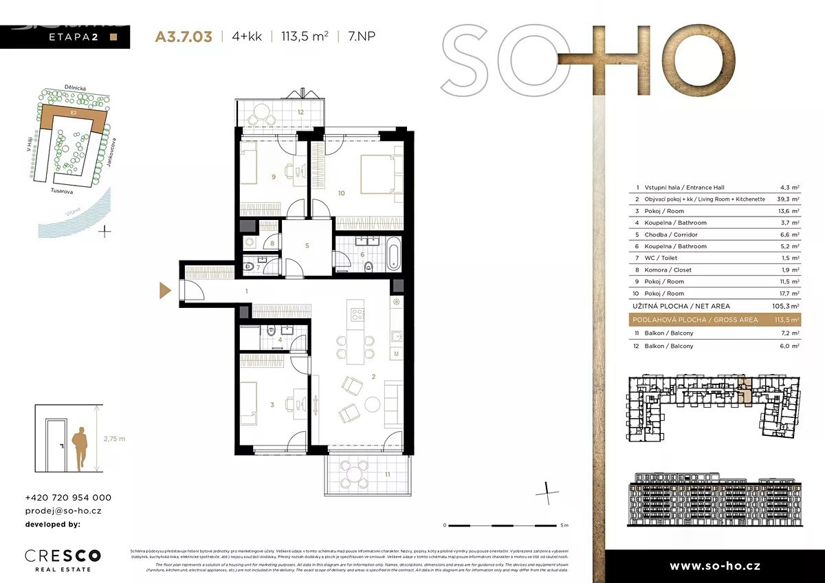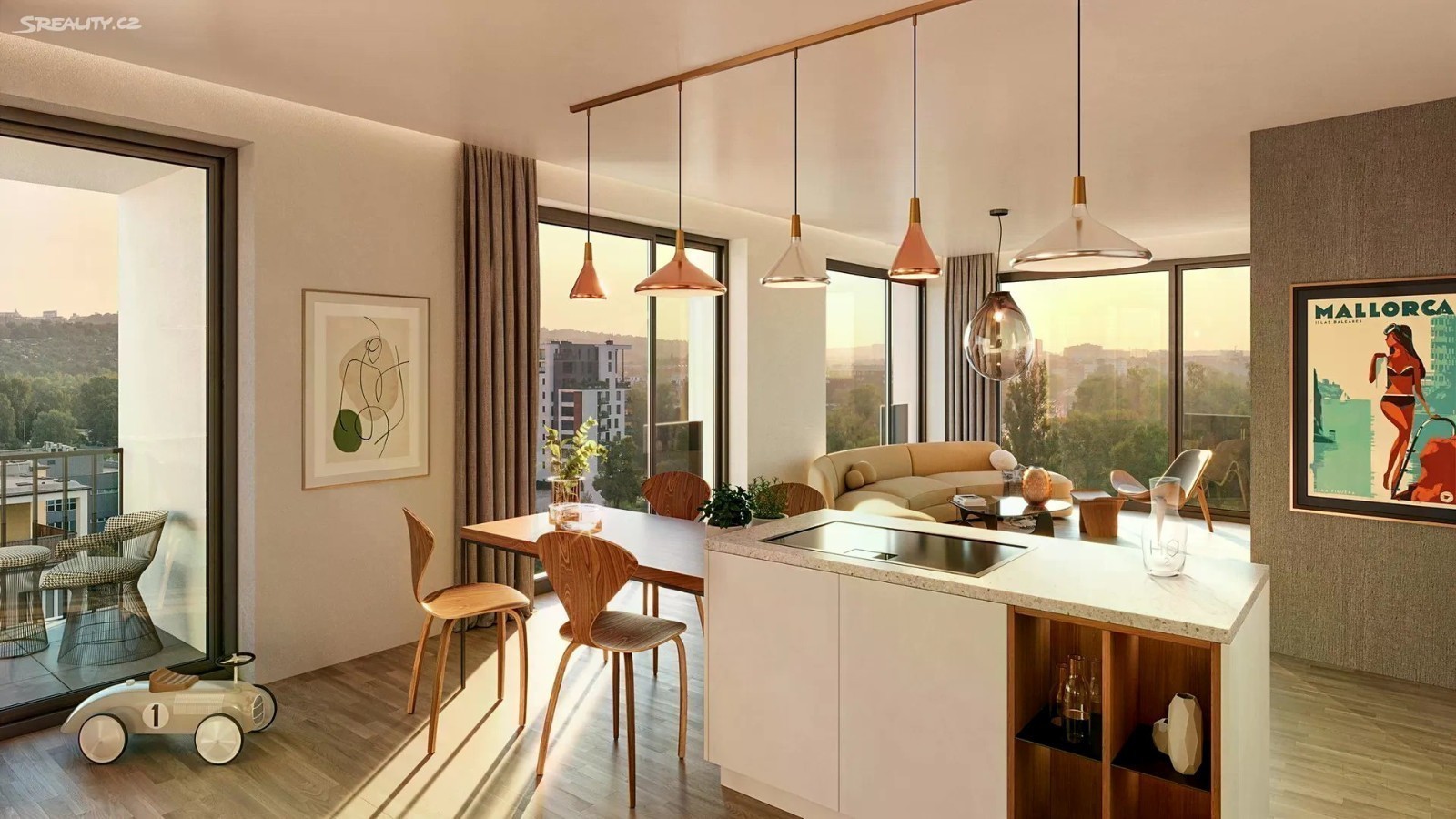 Světlý rohový byt s klimatizací o dispozici 4+kk (110,2 m²) se dvěma balkony (5,3 m² a 5,5 m²) se severovýchodní orientací do ulic Dělnická a Jankovcova se nachází ve 6. nadzemním podlaží moderní novostavby 2. etapy SO-HO Rezidence, v atraktivní lokalitě jižních Holešovic. Tento efektivně řešený byt nabízí prostorný (téměř 40 m²) vzdušný obývací pokoj propojený s jídelnou a kuchyní, což vytváří ideální zónu pro odpočinek i společenské aktivity. Byt má velkou ložnici s vlastní koupelnou a další dva pokoje. Vstupní hala poskytuje dostatek místa pro úložný prostor. Byt vyniká moderním designem od renomovaného architektonického studia QARTA Architektura, které klade důraz na kvalitu, funkčnost a precizní detaily. Interiér je vybaven prémiovým standardem: klimatizací, dřevěnými celoplošně lepenými podlahami, podlahovým topením, bezfalcovými dveřmi s výškou 2,1 m, velkoformátovými hliníkovými okny s izolačním trojsklem a elektricky ovládanými předokenními screenovými roletami. K bezpečnosti přispívají vstupní dveře 3. bezpečnostní třídy. V koupelně najdete velkoformátové obklady a dlažby a podomítkové baterie. Na přání je možné vybavení bytu nebo jeho dispozici individuálně přizpůsobit v rámci klientských změn. SO-HO Rezidence se nachází v dynamické části Holešovic, která nabízí nejen kvalitní bydlení, ale i širokou občanskou vybavenost. Okolí láká množstvím gastronomických podniků, kaváren, kulturních a uměleckých aktivit - DOX, současné umění, divadelní scény a moderní street art. Milovníci přírody ocení nedalekou Stromovku pro relaxaci a sportovní vyžití. Součástí prodeje je i sklep. Parkovací stání není v ceně, ale je možné ho dokoupit. Projekt je ve výstavbě, předpokládané dokončení je plánováno na 4. čtvrtletí 2026. Prodej probíhá přímo od developera. Více informací o tomto bytě, projektu a aktuální nabídce bytů z 2. etapy najdete na webových stránkách projektu. Rádi vás přivítáme také v našem prodejním centru: Classic 7, Budova C (přízemí), Jankovcova ********* Praha 7.
