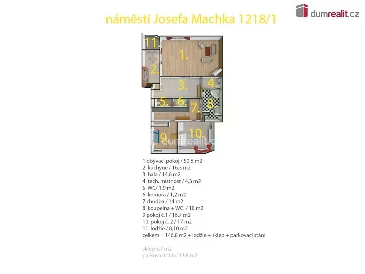 Hledáte opravdu velký byt, ideálně v Praze 5 - Malvazinky, nedaleko parku, v absolutním klidu a rodinném prostředí? Právě pro vás zde mám byt o velikosti 146,8 m² s lodžií 8,1 m², sklepem 5,7 m² a parkovacím stáním 13,8 m² přímo v domě, který má vlastní soukromou zahradu o velikosti 1666 m². Tento byt s vlastním plynovým krbem je umístěn v 1.patře pětipatrového bezbariérového domu z roku 1999, nyní s novým výtahem. Aktuální dispozice bytu je 3+1, velmi jednoduchou úpravou nový majitel docílí dispozice 4+kk - viz 3d plánky v prezentaci. Obývací pokoj tohoto bytu je dostatečně velký, aby zde v budoucnu byla umístěna i kuchyňská linka s jídelnou (50,8 m²), místo dnešní kuchyně (16,3 m²) lze vytvořit ložnici, dále je v bytě prostorná hala (14,6 m²) s bezpečnostním dveřmi a alarmem, dva pokoje v zadní části bytu (17 m² + 16,7 m²), chodba / šatna (14 m²) s vestavěnou skříní přímo u pokojů, nadstandardně velká koupelna (10 m²) s rohovou vanou, sprchovým koutem, umyvadlem, WC a bidetem. U vstupní haly je samostatné WC (1,9 m²), komora (1,2 m²) a technická místnost (4,3 m²) s plynovým kotlem, zásobníkem na vodu a prostorem na pračku a sušičku. Dispozice bytu je velmi praktická, byt je v top stavu, vše plně funkční a ihned k užívání - bez nutnosti dalších investic. Pro nového vlastníka se přímo nabízí změna dispozice na 4+kk - více info v RK. K bytu patří sklep (5,7 m²) a parkovací stání v suterénu domu. Zahrada okolo domu je oplocena, je soukromá - pouze pro vlastníky bytů. Vytápění bytu je pomocí vlastního plynového kotle - velmi praktické. Kompletní prezentace vč. více fotografií je na našeich stránkách. V okolí domu je absolutní klid - rodinné prostředí, nedaleko jsou školy, školky. Přímo za domem je vstup do lesoparku Šalamounka a Měchurka, zastávka MHD Malvazinky je 4 minuty pěšky a přímo u zastávky je obchod Albert. Velmi doporučuji všem, kteří hledají velký byt v klidné části Prahy 5 s možností rodinného bydlení. Ev. číslo: 649544.