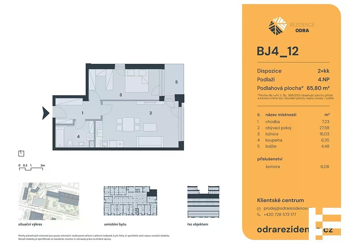Byt 2+kk s lodžií v Rezidenci Odra - nový začátek v srdci Bohnic Hledáte nový domov v klidné a přitom skvěle dostupné lokalitě? Rezidence Odra je moderní projekt s duší i budoucností, který vzniká na místě bývalého obchodního centra v pražských Bohnicích. Nyní vám nabízíme konkrétní volnou jednotku 2+kk o ploše 68,12 m², nacházející se ve 2. nadzemním podlaží budovy ve fázi dokončení. Dispozice bytu: prostorná vstupní chodba - 5,3 m² obývací pokoj s kuchyňským koutem - 28,03 m² ložnice - 14,05 m² koupelna - 5,05 m² šatna - 5,78 m² lodžie orientovaná na jih - 4,66 m² komora umístěná mimo byt - 6,68 m² Byt zaujme vysokými stropy, které umocňují vzdušnost interiéru, a velkoformátovými okny s jižní orientací, díky nimž je prostor krásně prosvětlený. Součástí bytu je i útulná lodžie, ideální k ranní kávě nebo večernímu odpočinku. Možnost parkování: Ke každé bytové jednotce lze dokoupit garážové stání v 1. nebo 2. podzemním podlaží za cenu 550 000 Kč. Technické standardy zahrnují: vinylové podlahy s lištami nebo rektifikovanou dlažbou plasto-hliníková okna s izolačními trojskly bezpečnostní vstupní dveře teplovodní podlahové vytápění elektrická příprava pro předokenní žaluzie Skvělá lokalita: Doprava: autobusová zastávka přímo u domu, stanice metra C - Kobylisy jen pár minut jízdy Občanská vybavenost: školy, školky, zdravotnická zařízení, pošta, OC Krakov - vše v pěší vzdálenosti Příroda: Ďáblický háj, přírodní park Troja, botanická a zoologická zahrada, aquapark Šutka O projektu: Rezidence Odra nabídne celkem 71 bytových jednotek o dispozicích od 1+kk po 4+kk a také komerční prostory v přízemí - např. prodejnu DM drogerie nebo obchod Action. Projekt splňuje požadavky vládního nařízení č. 366/2013 Sb. Kontaktujte nás Více informací naleznete na webu odrarezidence. Rádi vás přivítáme osobně - naše kanceláře najdete na adrese: Dock In Five, Boudníkova 2538/13, Praha 8 - Libeň Schůzky si, prosím, rezervujte předem telefonicky nebo e-mailem. Těšíme se na vás! Tým Esty