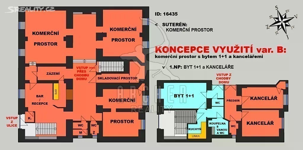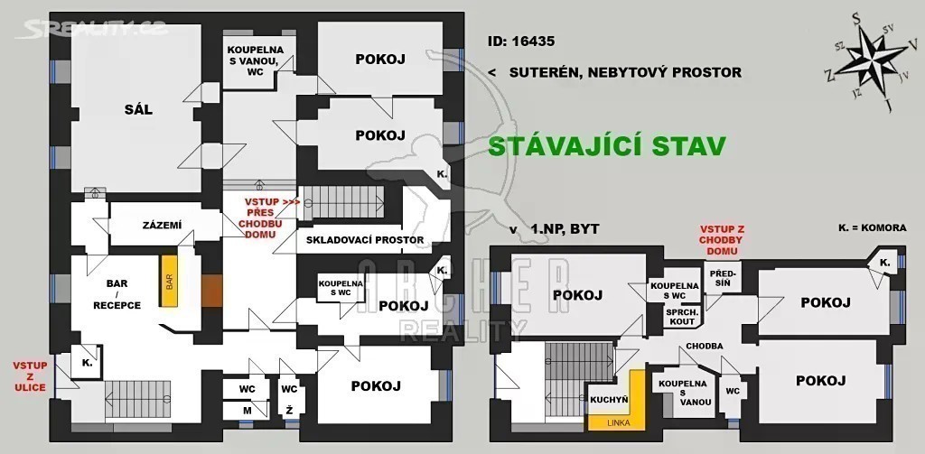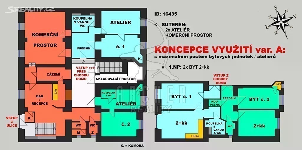 Nabízíme k prodeji byt 3+1 v OV, 72 m2 spojený s komerčním prostorem 190 m2, vhodným pro restauraci, klub nebo prodejnu, Praha 10 - Vršovice, ul. Slovinská. Byt, ve stávajícím stavu s dispozicí 3+1 a podlahovou plochou 72 m2, je rekonstruovaný a nachází se ve zvýšeném 1.NP v tradičním cihlovém domě z počátku 20. století v ulici Slovinská. Obývací pokoj je situován do ulice s okny směřujícími na západ, oba pokoje mají okna do klidného zeleného vnitrobloku a jsou orientována východně. K jednomu z pokojů přiléhá malá komora, kterou lze přestavět na kuchyňský kout. Podlahy v celém bytě jsou plovoucí. K dispozici je koupelna s vanou, samostatné WC a také koupelna se sprchovým koutem a WC. V bytě jsou stropy vysoké 3,26 m, v současné době snížené o 12 cm sádrokartonovým podhledem. Bytovou jednotku lze rozdělit na dva byty (až 2x 2+kk), neboť z chodby domu vedou do bytu dvoje dvoukřídlé dveře. Aktuálně je byt přístupný i přímo z ulice. Tento vchod lze ale zrušit a nahradit místností, využívající plně půdorys stávající haly, a to při zachování přístupu z ulice do komerčního prostoru v suterénu. Komerční prostor, náležející k bytu, sestává ze suterénních prostor, upravených jako restaurace či klub a dvou ateliérů s celkovou podlahovou plochou 190 m2 Suterénní prostor je vhodný pro široké spektrum komerčních činností nebo jako reprezentativní sídlo firmy. Možné je provozování restaurace, baru, klubu nebo jej lze rekonstruovat na prodejnu, kancelářské prostory, grafické studio, pro služby atd. atp. Ve stávajícím stavu jsou zde zkolaudovány i dva dvoupokojové ateliéry s koupelnou a WC. Stropy ve sklepních prostorách jsou klenbové s pohledovými cihlami, v části s největší výškou 2,9 m, v části 2,5 m. Je zde koupelna s vanou a WC a samostatná WC pro návštěvníky, samostatně pro muže a pro ženy. Do nemovitosti jsou k dispozici celkem 4 vchody, 1 přímo z ulice do suterénu a bytu, 3 z chodby domu. Lze také využívat dvorek domu. U makléře je k dispozici přesný půdorys zaměřený na místě. Prostory je vhodné vidět, mají svou nezaměnitelnou atmosféru. Nemovitost je aktuálně na katastru nemovitostí zapsána jako celek bytu se suterénními prostory jako nebytový prostor, ale existuje kolaudační rozhodnutí, kterým lze nemovitost rozdělit na KN na byt a nebytový prostor. Dopravní dostupnost je výborná. Zastávka autobusů 101 a 135 Slovinská je přímo za rohem, v dochozí vzdálenosti je zastávka tramvají ********* a 32 Vršovické náměstí. V okolí veškerá občanská vybavenost. Na tuto nemovitost Vám pomůžeme zajistit financování s nízkou úrokovou sazbou. Doporučujeme prohlídku. Třída G - Mimořádně nehospodárná - Energetický štítek budovy (PENB) nebyl dodán.