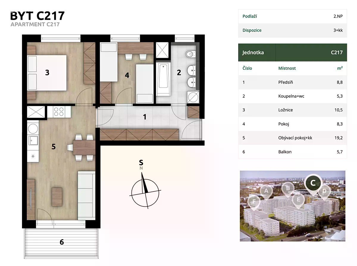 Ekocity Hostivař | Nejlepší ceny bytů v Praze! Nádherný byt C217 s dispozicí 3+kk a podlahovou plochou 57 m² v projektu Ekocity Hostivař. Byt disponuje obývacím pokojem spojeným s kuchyňským koutem, ložnicí, pokojem, koupelnou s WC a balkonem o velikosti 5,7 m². V nabídce máme i spoustu dalších bytů dispozic 1+kk až 3+kk. Více na našich webových stránkách. Ekocity Hostivař leží v atraktivní lokalitě s výbornou dopravní dostupností a bohatou možností sportovního i relaxačního vyžití. Zásadní výhodou projektu jsou mimořádně nízké ceny, které jinde nenajdete. Dlouhodobou strategií Ekospolu je nabízet cenově příznivé a přesto velmi kvalitní byty dostupné co nejširšímu množství zájemců. Projekt Ekocity Hostivař toto rozhodně splňuje, což potvrzuje i garance nejnižší ceny. Pokud najdete u jiného developera byt se stejnými nebo lepšími parametry za nižší cenu na metr čtvereční, cenu vám nejen dorovnáme, ale navíc snížíme o dalších 100 000 Kč! Kompletní podmínky najdete na našich stránkách. Tento projekt je svou mimořádně nízkou cenou vhodný jak pro vlastní bydlení, tak jako výborná investiční příležitost. Ekocity Hostivař je jedinečný projekt rezidenčního bydlení ve vyhledávané lokalitě pražské Hostivaře s výbornou dopravní dostupností a v docházkové vzdálenosti od přírodního parku Hostivař-Záběhlice s Hostivařskou přehradou. Samozřejmostí je plná občanská vybavenost v docházkové vzdálenosti. Moderní nízkoenergetický bytový dům D nabízí celkem 124 jednotek dispozic 1+kk až 3+kk s balkony, terasami či předzahrádkami. Možnost parkování na krytých parkovacích stáních či venku přímo u domů. Tento projekt je díky své neopakovatelné ceně vhodný nejen pro jednotlivce či mladé rodiny, ale také jako výborná investiční příležitost. Unikátní možnosti vyžití: Ekocity Hostivař se nachází v blízkosti rozlehlého lesoparku s vodní nádrží sloužící ke koupání i dalším vodním sportům včetně vodního vleku. Kompletní občanská vybavenost: Mateřská škola přímo v areálu. Restaurace, základní škola, lékárna, pošta a mnoho obchodů přímo v místě. Vynikající dopravní dostupnost: Zastávka autobusu přímo u projektu, 9 minut MHD na metro A - Skalka, Nádraží Praha Hostivař jen 5 minut pěšky, 14 minut vlakem na Hlavní nádraží, 5 minut autem na Pražský okruh.