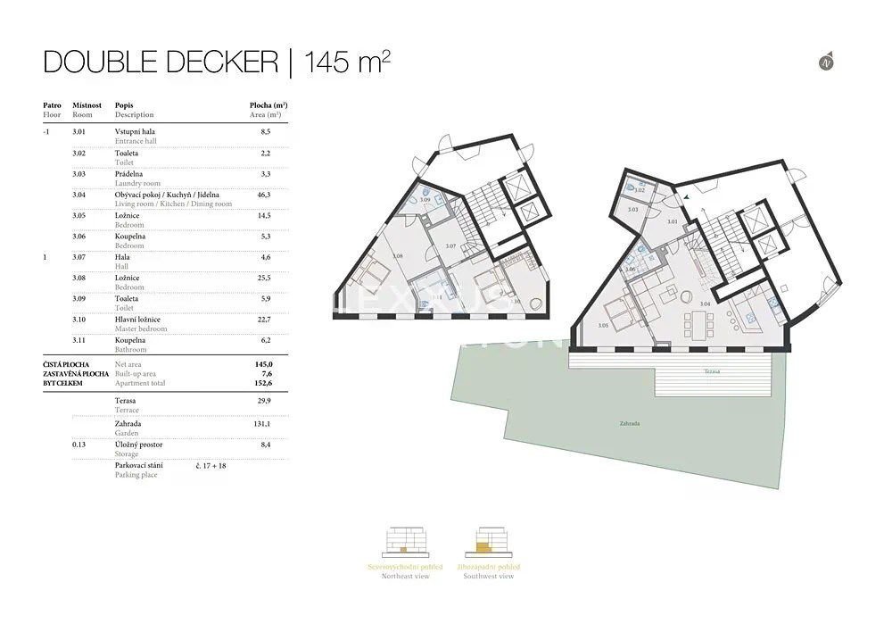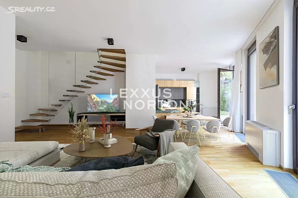 K prodeji nabízíme prakticky řešený mezonetový byt 4+kk s užitnou plochou 145 m2. V přízemí bytu se rozprostírá prostorný obývací prostor s přípravou pro kuchyňský kout a ložnice s vlastní koupelnou se sprchovým koutem. Z obývacího pokoje i ložnice s francouzskými okny je přímý vstup na terasu (29,9 m2) a zahradu (131 m2). V prvním patře bytu jsou další dvě prosvětlené ložnice, každá s vlastní koupelnou a šatnou. V bytě je dále k dispozici technická místnost a samostatná toaleta se vstupem z předsíně bytu. K bytu náleží sklep (8,4 m2) a dvě parkovací stání v podzemní garáži. K vysokému standardu vybavení bytu patří dvouvrstvé dřevěné podlahy, kvalitní velkoformátové obklady v koupelnách, sanita značky Laufen a Hansgrohe, dřevěná okna s termoizolačním trojsklem, bezpečnostní vstupní dveře NEXT, bezfalcové a posuvné interiérové dveře, skleněné zábradlí na schodišti. V bytě je příprava pro systémy inteligentní elektroinstalace, podlahové vytápění a podlahové konvektory. V objektu je tepelné čerpadlo se zemními vrty, které zajišťuje topení a chlazení všech obytných místností. Jako záložní zdroj je v domě plynový kotel. Byt se nachází v luxusní rezidenci na Praze 6 v oblíbené čtvrti Bubeneč v ulici Rooseveltova. V lokalitě je k dispozici veškerá občanská vybavenost včetně škol, školek, vyhlášených restaurací, kaváren, obchodů či lékařů. V docházkové vzdálenosti je zastávka metra A - Dejvická. Autobusová a tramvajová zastávka je necelých 5 minut pěšky od rezidence. Do centra města je to necelých 15 minut autem. Na Letiště Václava Havla potom zhruba 20 minut. Relax a sportovní vyžití nabízí park Stromovka, který je vzdálený asi 3 minuty chůze. V inzerci jsou použity vizualizace možného řešení interiéru, byt není vybaven kuchyňským koutem a nábytkem.