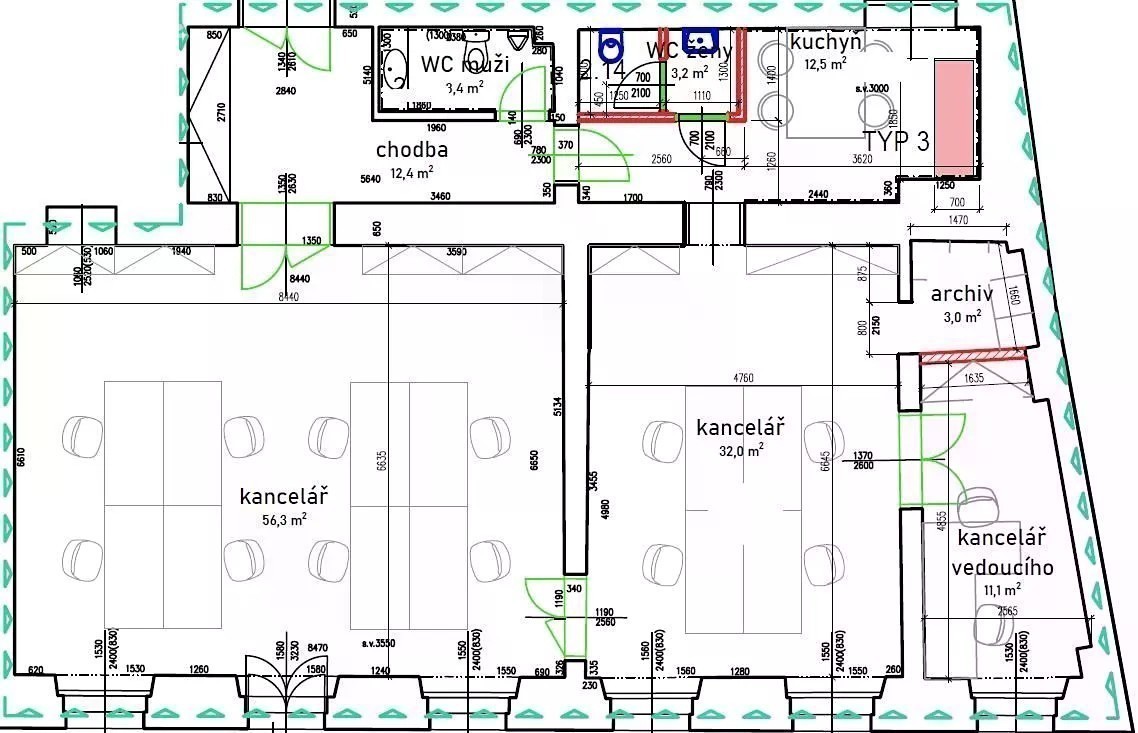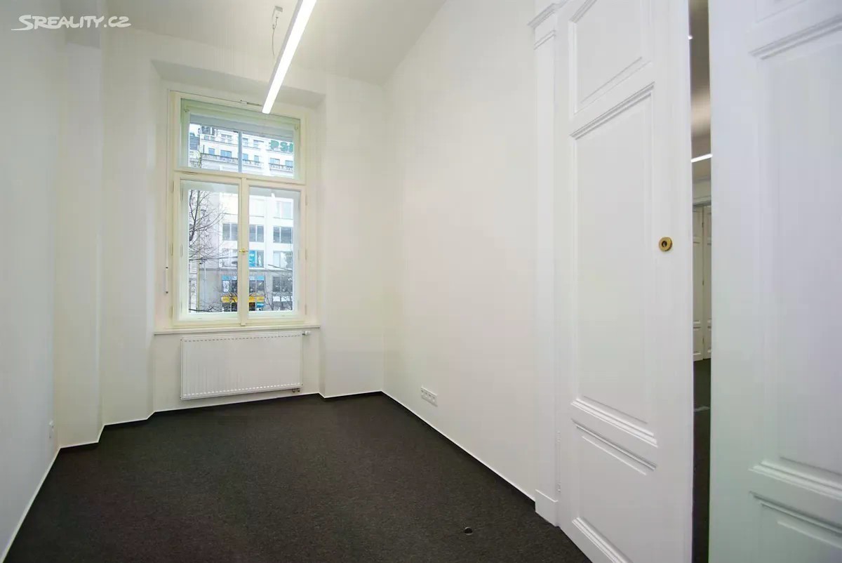Klimatizované kancelářské prostory 3+1, o celkové užitné ploše 133,9m2, jsou situovány v prvním patře zrekonstruované historické budovy s výtahem, v prestižní lokalitě Nové Město na Praze 1, na Václavském náměstí. Prostory jsou nezařízené a dispozičně nabízí vstupní chodbu (12,4m2), tři samostatné kanceláře (11,1m2, 32m2 a 56,3m2), čajovou kuchyňku (12,5m2) vybavenou spotřebiči (varná deska, lednice, myčka), dvě samostatné toalety (3,4m2 a 3,2m2) a archiv (3m2). Prostory jsou orientovány na Václavské náměstí. Na chodbě, toaletách, v kuchyňce a archivu jsou vinylové podlahy, v kancelářích jsou koberce. Ve všech místnostech jsou rozvody sítí (zásuvky, internet, optický kabel). Velmi prestižní lokalita přímo na Václavském náměstí, s veškerou občanskou vybaveností v okolí (supermarkety, nákupní zóna, banky, restaurace, kavárny, bistra, pekárny, a mnoho dalšího) a v blízkosti historických památek centra Prahy. Výborná dopravní dostupnost MHD stanice metra A/C Muzeum, tramvajové zastávky Muzeum/Václavské náměstí. Zálohové poplatky za služby 14.400, Kč / měs. a energie se hradí zvlášť. Vratná kauce 2 nájmy včetně poplatků. Provize RK. Možnost pronájmu parkovacího místa dle volné kapacity.