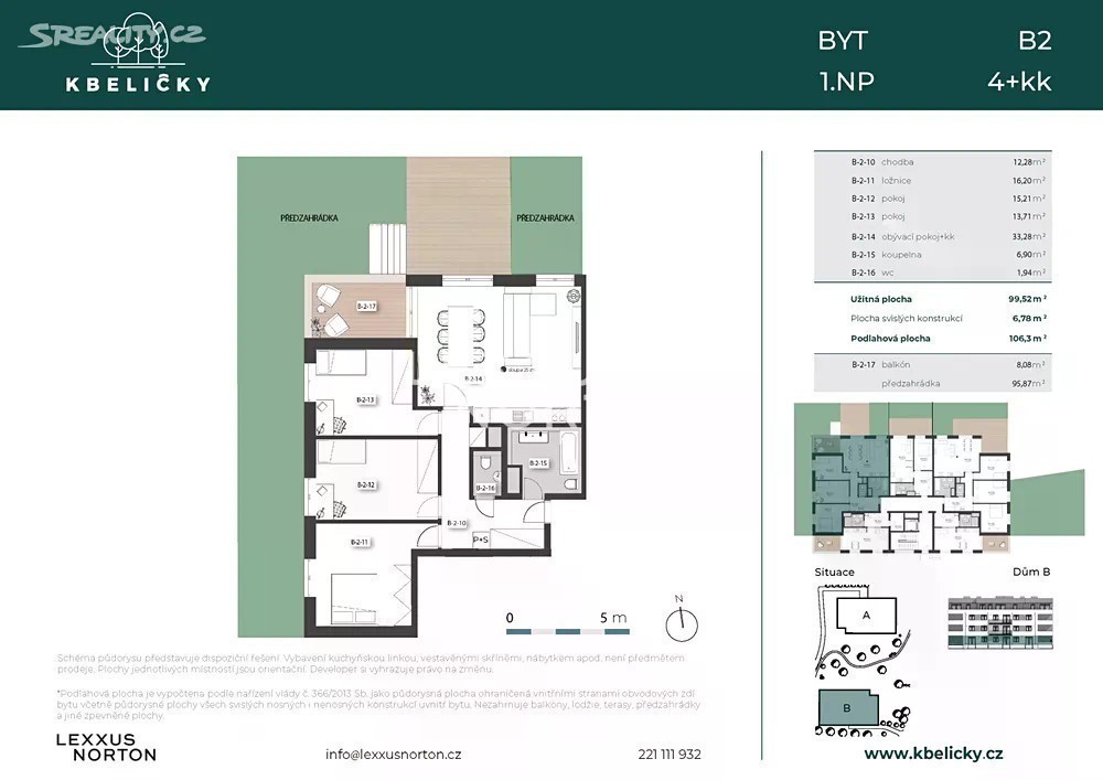 Představujeme jedinečnou příležitost k tomu získat moderní, prostorný byt 4+kk k prodeji o užitné ploše 106,35 m² a splnit si tak sen o ideálním domově v atraktivním novém bytovém projektu Bydlení Kbeličky, který je synonymem pro nadčasovost a bere v potaz také ekologické řešení. V rámci areálu máte mimo jiné k dispozici venkovní sportoviště a dětské hřiště. Světlý interiér bytu, který se nachází v prvním nadzemním podlaží, je tvořen vstupní chodbou (12,29 m²), 3 prostornými ložnicemi o velikostech 16,24 m², 15,21 m² a 13,7 m² a přímým vstupem na nádhernou předzahrádku o rozloze 160,79 m², kde můžete relaxovat a užívat si klidu na čerstvém vzduchu. Reprezentativní obývací pokoj spojený s kuchyňským a jídelním koutem (33,28 m²). Byt je vybaven samostatnou toaletou a koupelnou s toaletou a vanou. V suterénu projektu naleznete místnost pro mytí kol a psů, kolárnu a kočárkárnu. K bytu je možné přikoupit parkovací stání a sklep, které nejsou zahrnuty v uvedené ceně. Atraktivní lokalita Prahy 9 - Kbeličky se vyznačuje bohatou přírodou, malebnými lesoparky a cyklostezkami. V pěší vzdálenosti se nachází stanice metra Letňany a železniční stanice Kbely. Plánovaná nová linka elektrobusu rovněž usnadní každodenní dojíždění. K aktivnímu odpočinku v přírodě lze využít např. Lesopark Letňany, Centrální park Kbely a Klíčovské sady. V blízkosti jsou obchodní centra, restaurace, sportoviště, mateřské i základní školy a lékařská péče, což zajišťuje veškerou občanskou vybavenost.