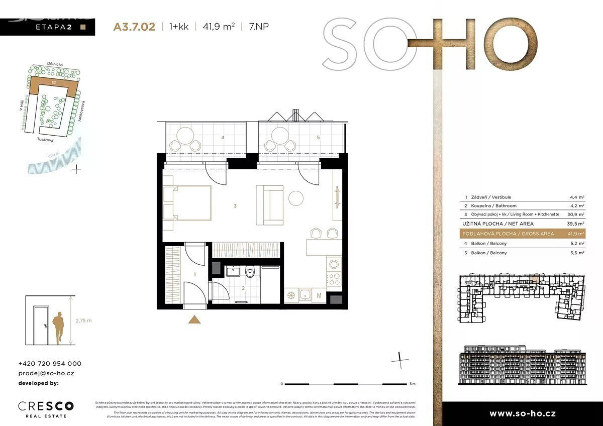 Kompaktní byt 1+kk (36,6 m2) s balkonem (4,3 m2) se nachází v 6. nadzemním podlaží moderní novostavby 2. etapy SO-HO Rezidence, v atraktivní lokalitě jižních Holešovic. Tento účelově řešený byt nabízí otevřený obývací pokoj propojený s jídelní a kuchyňskou částí, na který navazuje balkon s orientací na západ do klidné ulice V Háji. V prostorné koupelně najdete kromě sprchového koutu, umyvadla a WC i dostatek místa na pračku. Byt vyniká moderní architekturou od renomovaného architektonického studia QARTA Architektura, které klade důraz na kvalitu, funkčnost a precizní detaily. Interiér je vybaven prémiovým standardem: dřevěnými celoplošně lepenými podlahami, podlahovýmtopením, bezfalcovými dveřmi s výškou 2,1 m, velkoformátovými hliníkovými okny s izolačním trojsklem a elektricky ovládanými předokenními screenovými roletami. K bezpečnosti přispívají vstupní dveře 3. bezpečnostní třídy. V koupelně najdete velkoformátové obklady a dlažby a podomítkové baterie. Na přání je možné vybavení bytu nebo jeho dispozici individuálně přizpůsobit v rámci klientských změn. SO-HO Rezidence se nachází v dynamické části Holešovic, která nabízí nejen kvalitní bydlení, ale i širokou občanskou vybavenost. Okolí láká množstvím gastronomických podniků, kaváren, kulturních a uměleckých aktivit - DOX, současné umění, divadelní scény a moderní street art. Milovníci přírody ocení nedalekou Stromovku pro relaxaci a sportovní vyžití. Součástí prodeje je i sklep. Parkovací stání není v ceně, ale je možné ho dokoupit. Projekt je ve výstavbě, předpokládané dokončení je plánováno na 4. čtvrtletí 2026. Prodej probíhá přímo od developera. Více informací o tomto bytě, projektu a aktuální nabídce bytů z 2. etapy najdete na webových stránkách projektu. Rádi vás přivítáme také v našem prodejním centru: Classic 7, Budova C (přízemí), Jankovcova ********* Praha 7.
