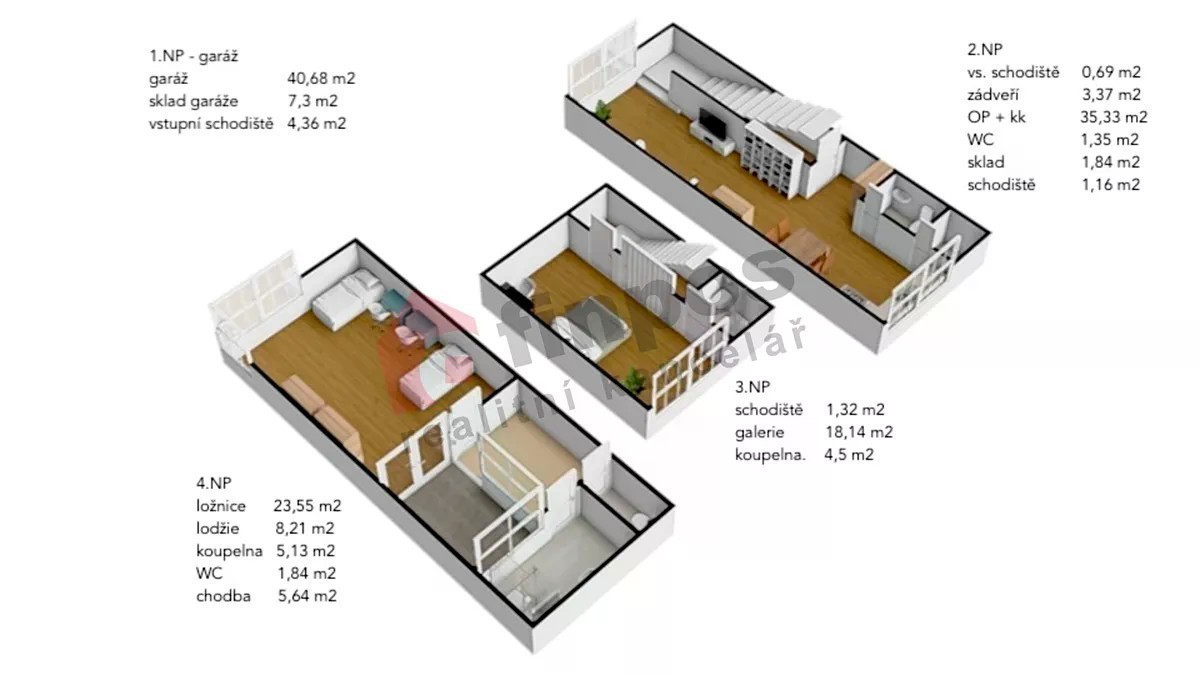 Byt 3kk na Zličíně - domov, kancelář i investice v jednom! Nabízíme k prodeji byt na pražském Zličíně, který skvěle poslouží jako rodinné bydlení, investiční příležitost nebo reprezentativní sídlo firmy. Na velkorysé užitné ploše 105 m² + garáž se rozkládají čtyři podlaží se zajímavou dispozicí: Přízemí: garáž 52,34 m² pro dvě auta - velký bonus v této lokalitě. 2. NP: obývací pokoj s kuchyňským koutem, toaleta a sklad. Stropy s výškou cca 4 m dodávají prostoru vzdušnost a světlo. 3. NP: obytná galerie s koupelnou a šatnou. 4. NP: útulný pokoj s koupelnou, WC a lodžií. Byt je ve velmi dobrém stavu, vytápěný lokálním plynovým topením v podlaze a napojený na veřejný vodovod i kanalizaci. Perfektní lokalita: - Metro Zličín a OC Metropole jen 900 m od domu. - Vlaková zastávka 950 m. - Pražský okruh v dosahu 1,2 km. - Letiště na dosah - ideální pro časté cestovatele. Zličín nabízí kompletní občanskou vybavenost, skvělou dopravní dostupnost a zároveň klidnější bydlení na okraji Prahy. Tato nemovitost spojuje komfort, praktičnost a skvělou polohu. Pro investory navíc nabízí výnosnost cca 4,5 % p.a. v případě dlouhodobého pronájmu - což dělá z této nabídky ještě atraktivnější příležitost. Neváhejte a dorazte na osobní prohlídku.