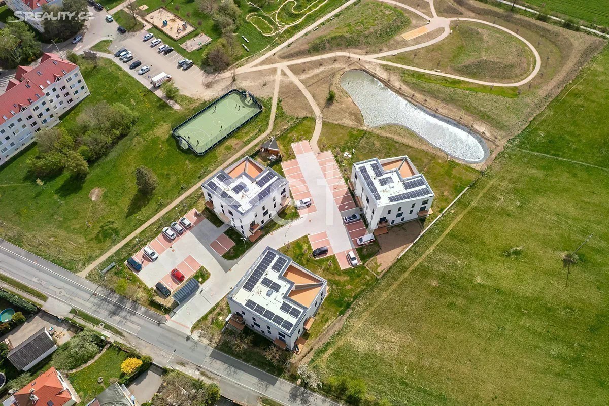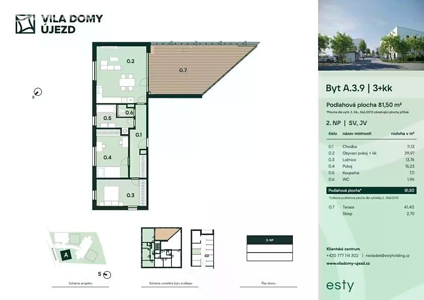 Nové bydlení v bytových domech ve vlastním rezidenčním areálu Nechte se pozvat na prohlídku Vašeho nového domova v Újezdě nad Lesy. Bytový projekt reprezentuje příjemné bydlení zasazené do rodinného prostředí a nabízí moderní nadčasový design. Nabízíme velikosti bytů od kompaktních 1+kk až po prostorné 3+kk uspokojí každého. Všechny jednotky se jsou obohaceny venkovním prostorem - ať už předzahrádkou, terasou, či balkonem. Byty jsou ihned k nastěhování. Technologie Koncept bydlení je navržený s ohledem na trvalou udržitelnost, energetickou úspornost a harmonické začlenění do okolní zástavby. Vytápění budov je zajištěno tepelným čerpadlem, které v kombinaci s kvalitním zateplením, podlahovým topením a solárními panely významně sníží finanční náklady na vytápění a ohřev. Konkrétní bytová jednotka, kterou Vám nabízíme 3+kk plná světla a prostoru ve 3. podlaží objektu A. S plochou 81,5 m2 je ideální kombinací komfortu a funkčnosti. Byt se skládá z obývacího pokoje (29,97 m2), ložnice (13,76 m2), pokoje (15,23 m2), chodba (11,13 m2), koupelna (7,11 m2), samostatné WC (1,96 m2) a terasa (41,21 m2). K bytu náleží také sklep (2,7m2). Výměra bytové jednotky je v souladu s vládním nařízením č. 366/2013 Sb. Parkování Ke každému bytu je možné dokoupit parkovací místo, které bude připravené i pro nabíječky elektromobilů. Standardy Byt má ve standardním provedení vinylové podlahy s dekorem dřeva či WPC terasy v barvě kávy. Plastová okna s trojskly budou vybavena venkovními žaluziemi a lokálním elektrickým ovládáním. Vjezd do areálu bude na dálkové ovládání a celý prostor bude připraven pro zřízení kamerového systému. Každý byt můžeme doplnit o chytrou domácnost a v horních podlažích bude příprava na klimatizaci. Součástí dodávky není nábytek a kuchyňská linka. Vybavení rezidenčního areálu 3 bytové domy spolu s parkovacími stáními s přístupem do nově zbudované aleje s vlastním povrchovým okrasným jezírkem. V přímém sousedství na vzdálenější straně od bytových domů je k dispozici pumptrack, grilovací místo, dětské hřiště a venkovní posilovna. Okolí Okolí přináší vše důležité pro pohodlný moderní život - restaurace i kavárny, polikliniku s lékárnou, základní a mateřské školy, řadu dětských hřišť, ale také možnost zahrát si tenis, fotbal, využít místní knihovnu, vyrazit za kulturou do divadla, zajít si na masáž či wellness nebo i trénovat psa na nedalekém cvičišti. Relaxace a odpočinek Příjemné procházky a relaxaci v nedaleké Škvorecké oboře či Klánovickém lese. Doprava Busem MHD se dostanete k nejbližší stanici metra ČM za 20. min. Vlakem z Klánovic jste do půl hodiny přímo v centru Prahy. V budoucnu čeká Újezd na přímé napojení Pražského okruhu, který bude dostupný do 3 min. Schůzky, detaily výstavby, návštěva vzorového bytu Více informací najdete na webových stránkách projektu Viladomy-Újezd.