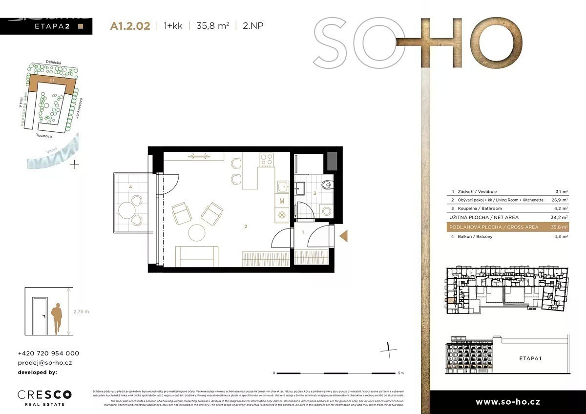 Kompaktní byt 1+kk (35,8 m²) s balkonem (4,3 m²) se nachází ve 2. nadzemním podlaží moderní novostavby 2. etapy SO-HO Rezidence v atraktivní lokalitě jižních Holešovic. Tento účelově řešený byt nabízí otevřený obývací pokoj propojený s jídelní a kuchyňskou částí, na který navazuje balkon s orientací na západ do klidné ulice V Háji. V prostorné koupelně najdete kromě sprchového koutu, umyvadla a WC i dostatek místa na pračku. Byt vyniká moderním designem od renomovaného architektonického studia QARTA Architektura, které klade důraz na kvalitu, funkčnost a precizní detaily. Interiér je vybaven prémiovým standardem: dřevěnými celoplošně lepenými podlahami, podlahovým topením, bezfalcovými dveřmi s výškou 2,1 m, velkoformátovými hliníkovými okny s izolačním trojsklem a elektricky ovládanými předokenními screenovými roletami. K bezpečnosti přispívají vstupní dveře 3. bezpečnostní třídy. V koupelně najdete velkoformátové obklady a dlažby a podomítkové baterie. Na přání je možné vybavení bytu nebo jeho dispozici individuálně přizpůsobit v rámci klientských změn. SO-HO Rezidence se nachází v dynamické části Holešovic, která nabízí nejen kvalitní bydlení, ale i širokou občanskou vybavenost. Okolí láká množstvím gastronomických podniků, kaváren, kulturních a uměleckých aktivit - DOX, současné umění, divadelní scény a moderní street art. Milovníci přírody ocení nedalekou Stromovku pro relaxaci a sportovní vyžití. Součástí prodeje je i sklep. Parkovací stání není v ceně, ale je možné ho dokoupit. Projekt je ve výstavbě, předpokládané dokončení je plánováno na 4. čtvrtletí 2026. Prodej probíhá přímo od developera. Více informací o tomto bytě, projektu a aktuální nabídce bytů z 2. etapy najdete na webových stránkách projektu. Rádi vás přivítáme také v našem prodejním centru: Classic 7, Budova C (přízemí), Jankovcova ********* Praha 7.
