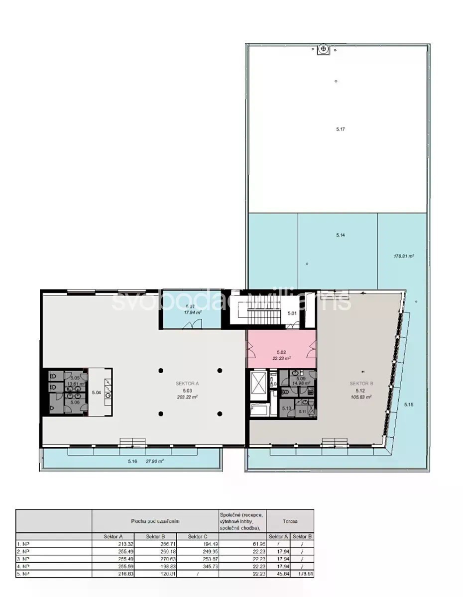 Kanceláře k pronájmu v 5. patře budovy, která byla navržena a postavena tak, aby odpovídala nejnovějším trendům a požadavkům moderního pracovního prostředí. Tento objekt se vyznačuje svým jedinečným interiérem, který kombinuje funkčnost s estetikou industriálního designu. Jedním z výrazných prvků tohoto designu jsou podlahy, jež jsou dokončeny cementovými potěry. Prostoru náleží i terasa, která poskytuje ideální místo pro odpočinek během pracovního dne. Pronájem terasy je zpoplatněn na 4 EUR/m2. Možnost dělení prostor: 216 m2 (terasa 46 m2) a 126 m2 (terasa 120 m2). Lokalita: Výborná dopravní dostupnost jak autem, tak veřejnou dopravu. V těsné blízkosti stanic metra Nádraží Holešovice (linka C), Vltavská (linka C) a Palmovka (linka B). Snadné napojení na hlavní silniční síť, včetně přímých spojů k dálnicím D1 směr Brno a D8 ve směru na Berlín. Vybavení a služby: Systémy EZS, EPS, UPS a CCTV Terasa a balkon ve všech patrech Parkování pro návštěvy v areálu Připojení na optický kabel Reprezentativní recepce Klimatizace a ventilace Parkování pro kola Otevíratelná okna Ústřední vytápění Osobní výtah Nájemné a poplatky jsou uvedeny bez DPH. Nájemce neplatí provizi.