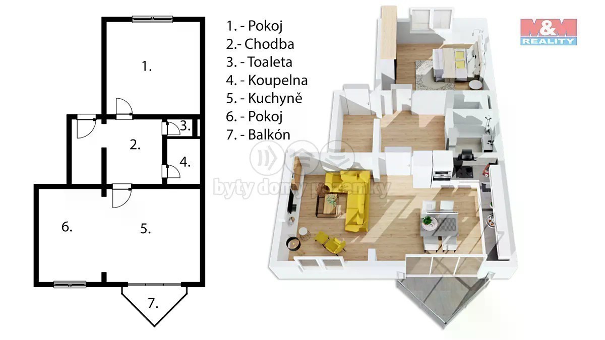 Prodej prostorného světlého bytu s podzemním parkovacím místem v ceně. Byt má plochu 59 m² + balkón 2 m² + sklep 1 m² a nachází se ve 3. nadzemním podlažím čtyřpodlažního domu z roku 2007. Současná dispozice bytu je 2+kk, lze však jednoduchou změnou upravit na původní dispozici 2+1 nebo ho upravit na 3+kk. Nábytek, kromě kuchyňské linky, zobrazený na fotografiích je vizualizace. V ceně bytu je sklepní kóje a jedno podzemní parkovací místo. K bytu je možné dokoupit ještě druhé venkovní parkovací místo. Dům je velmi klidné části Prahy 9 - Horních Počernicích, na kraji zástavby a na konci slepé ulice s výhledem do zeleně. MHD, ZŠ, MŠ a gymnázium je 300 m od domu.