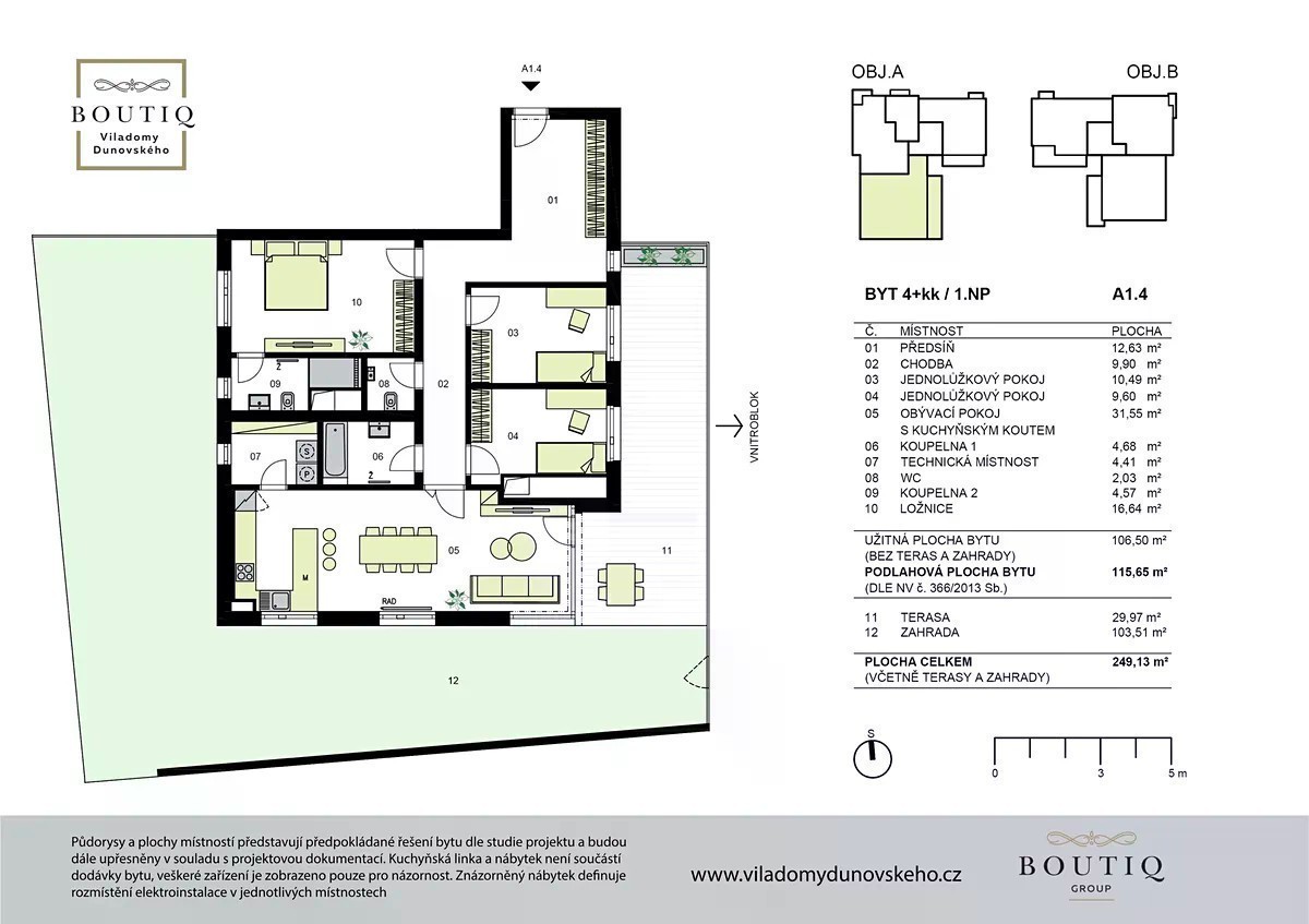 Nabízíme k prodeji moderní byt 4+kk s označením A.1.4. o podlahové ploše 116 m², zahrada 103m², terasa 30m², celková plocha 249m², v nově vznikající komorní rezidenci Viladomy Dunovského, situované v klidné části Prahy 11 - Chodov. Tento prostorný byt se nachází v 1. nadzemním podlaží a disponuje vlastní zahradou a terasou s orientací na jihozápad. Interiér bytu je navržen s důrazem na vysoký standard a komfort. Součástí vybavení jsou dřevěné podlahy, podlahové vytápění a velká úzkoprofilová okna s trojskly, která zajišťují dostatek přirozeného světla. Každý určitě ocení dvě koupelny a velmi praktickou technickou místnost. K bytu náleží sklep v ceně a lze dokoupit až dvě parkovací stání. Cena parkovacího stání činí 448 000 Kč a moto stání 224 000,- Kč včetně DPH. Viladomy Dunovského jsou navrženy v souladu s moderními trendy cohousingu, podporujícími komunitní bydlení a sdílení společných prostor. Rezidenti mohou využívat společnou oplocenou zahradu, smartboxy pro doručování zásilek, venkovní zahradní sprchu pro domácí mazlíčky a mycí box na kola. Termín dokončení je léto 2026. Lokalita nabízí vynikající občanskou vybavenost a dopravní dostupnost. V blízkosti se nachází mateřské a základní školy, obchodní centrum Chodov a sportovní areál Jedenáctka s plaveckým bazénem. Pro milovníky přírody jsou k dispozici nedaleké parky, jako je Centrální park či Park u Chodovské tvrze. Stanice metra Opatov je v docházkové vzdálenosti, což zajišťuje rychlé spojení do centra Prahy. Tento byt je ideální volbou pro rodiny hledající moderní a komfortní bydlení v klidné části Prahy s výbornou dostupností a širokou nabídkou služeb. Pro více informací nás neváhejte kontaktovat.