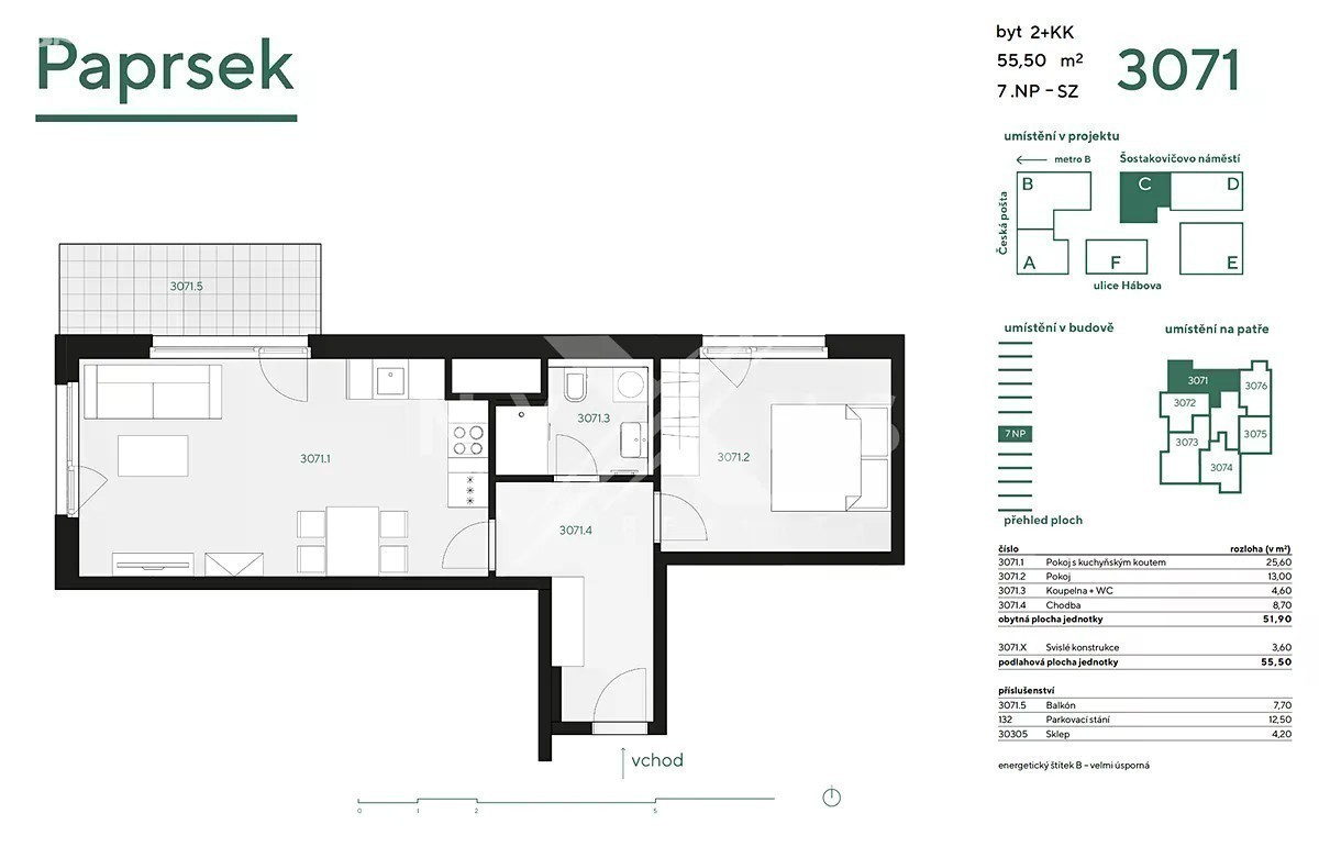Dovolujeme si Vám nabídnout postoupení nového družstevního bytu 2+kk o výměře 56 m² + balkón 7,7 m2 + sklep 4,2 m2 + garážové stání, v moderní, nové rezidenci, v ulici Hábova, Praha 5 - Stodůlky, přímo u metra. Byt se nachází v 7. NP s orientací oken na sever a západ. Cena včetně garážového stání a sklepa. Jelikož se jedná o družstevní byt, cenu splácíte formou nájmu Volný ihned. Atraktivní bydlení doplňuje skvělá poloha domu, v přímé blízkosti se nachází veškerá občanská vybavenost, včetně škol, školek, lékařů, obchodů a restaurací, nákupních center, centrální park, cyklostezka. Výborné dopravní spojení do centra, zastávka MHD 1 minutu od domu, metro Stodůlky před domem. Lokalita je vhodná jak k vlastnímu bydlení, tak za účelem pronajímání. Skvělá investiční příležitost. Odstupné za byt: 3 300 000 Kč Zbylá anuita: 6 902 400Kč Celková cena včetně anuity: 10 202 400Kč Nutno počítat s jednorázovým členským příspěvkem družstvu - 40 000 Kč. Energetický štítek náročnosti budovy nebyl zatím dodán, tudíž uvádíme G. V případě zájmu o tento byt, mne neváhejte kontaktovat.