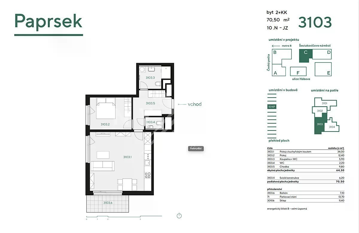 Dovolujeme si Vám nabídnout postoupení nového družstevního bytu přímo u metra, 2+kk o výměře 70,5 m² + balkón 7,1 m2 + sklep 11,4 m2 + garážové stání, v moderní rezidenci, v ulici Hábova, Praha 5 - Stodůlky. V této rezidenci máme v nabídce více bytů. Byt se nachází v 10. NP s orientací oken na jih a západ. V ceně je již zahrnuto: - garážové stání - velký sklep - předokenní žaluzie - hotové podlahy - příprava na klimatizaci - vzduchotechnika - inteligentní ovládání domácnosti Volný ihned. Atraktivní bydlení doplňuje skvělá poloha domu, v přímé blízkosti se nachází veškerá občanská vybavenost, včetně škol, školek, lékařů, obchodů a restaurací, nákupních center, centrální park, cyklostezka. Výborné dopravní spojení do centra, zastávka MHD 1 minutu od domu, metro Stodůlky před domem. Lokalita je vhodná jak k vlastnímu bydlení, tak za účelem pronajímání. Skvělá investiční příležitost. Odstupné za byt: 3 683 800 Kč Zbylá anuita: 8 695 200 Kč Celková cena včetně anuity: 12 379 000 Kč Nutno počítat s jednorázovým členským příspěvkem družstvu - 40 000 Kč. Energetický štítek náročnosti budovy nebyl zatím dodán, tudíž uvádíme G. V případě zájmu o tento byt, mne neváhejte kontaktovat.