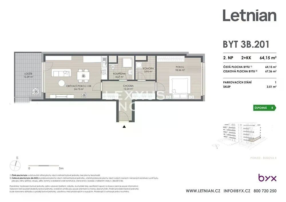 Nabízíme světlý byt 2+kk o celkové ploše 69,46 m², který se nachází ve 2. nadzemním podlaží rezidenčního projektu Letnian. Byt disponuje prostorným balkonem o výměře 11,2 m², který nabízí příjemný výhled a dostatek soukromí. Dispozici tvoří obývací pokoj s kuchyňským koutem, ložnice s dostatkem místa pro šatní skříň, koupelna s toaletou, komora a prostorná vstupní chodba. Byt je dokončen ve vysokém standardu, zahrnuje kvalitní laminátové podlahy, kvalitní obklady a sanitu koupelen, přípravu na venkovní elektrické žaluzie a kompletní přípravu pro kuchyňskou linku. K bytu lze dokoupit parkovací stání v podzemní garáži a sklep. Součástí projektu je společná zahrada s relaxační zónou a dětským hřištěm. Projekt Letnian se nachází v Letňanech, které nabízejí kompletní občanskou vybavenost - školy, školky, restaurace, kavárny, aquapark a další sportovní zařízení. Obchodní centrum Letňany je vzdáleno pouhé 2 min chůze. Dopravní spojení je vynikající, autobusová zastávka je vzdálena 200 m od rezidence a metro Letňany je jen pár minut od projektu. Snadný přístup na Pražský okruh umožňuje také rychlé spojení autem.