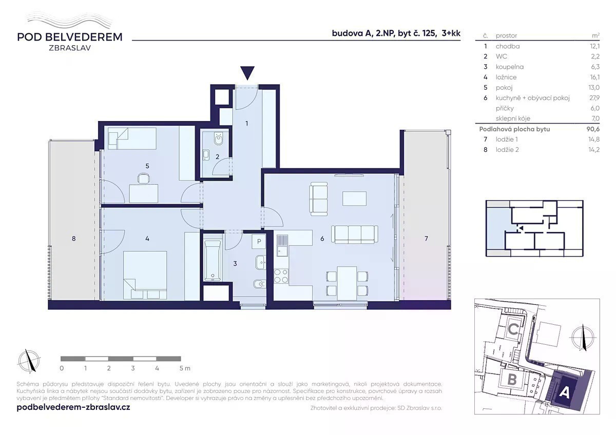 Objevte kouzlo bydlení v komorním rezidenčním projektu Pod Belvederem Zbraslav. Navíc s možností získat dotovanou hypotéku s úrokem od 2,89 %! V klidné části Zbraslavi pod lesoparkem Belveder vznikne ve třech samostatných bytových domech 36 bytů s dispozicemi 1+kk až 4+kk, navržených s ohledem na funkčnost i komfort svých obyvatel. Byt č. 125 se nachází v 2. NP budovy A. Má sympaticky řešené dispozice s výměrou podlahové plochy přes 83,6 m², dvě prostorné lodžie o celkové výměře 29 m², náleží k němu jedna sklepní kóje (7 m²)a kryté garážové stání. Dům je centrálně vytápěn pomocí tepelného čerpadla vzduch/voda se samostatným měřením pro každý byt. Díky podlahovému vytápění, oknům s izolačním trojsklem a kvalitní izolaci je objekt zařazen do energetické třídy B. Intimní developerský projekt Pod Belvederem Zbraslav klade důraz na moderní architekturu a vysoce kvalitní vybavení již ve standardu. V obývacím pokoji je HS portál a příprava na klimatizaci. Byt je promyšleně navržen tak, aby poskytl svým budoucím majitelům prostor i soukromí, pohodlí i styl. Podívejte se na stránkách projektu i na ostatní byty z aktuální nabídky.