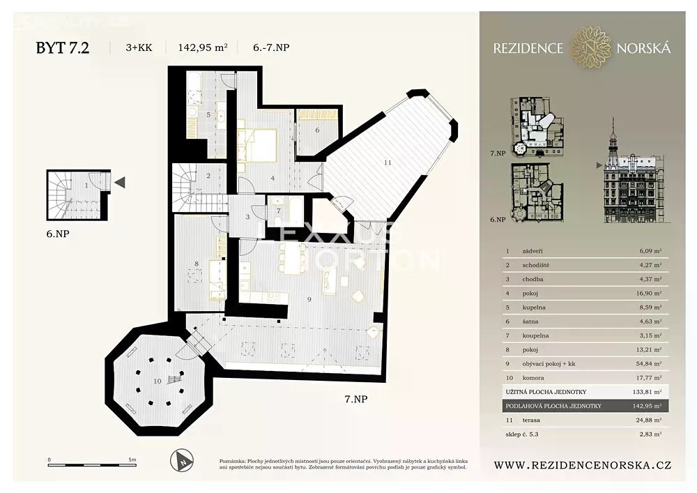 Představujeme originální byt 4+kk o rozloze 139 m2 s velkorysou venkovní terasou o rozloze 25 m². Vstupní hala bytu se nachází v 6. nadzemním podlaží, odkud po schodišti vystoupáte do hlavní obytné části v 7. nadzemním podlaží. Dispozici tvoří prostorný obývací pokoj s kuchyňským koutem a přímým vstupem na terasu, hlavní ložnice s vlastní koupelnou, šatnou a druhým vstupem na terasu, dále druhý pokoj s vlastní koupelnou a samostatná pracovna umístěná v nárožní věži domu. Právě věž činí tento byt naprosto jedinečným - stává se originální součástí interiéru a dodává mu neopakovatelnou atmosféru a jedinečný genius loci. Byt nabízí rozměrné místnosti s vysokými stropy a dechberoucí výhledy na jižní část Prahy i zeleň Heroldových sadů. Historický secesní dům prošel kompletní a citlivou rekonstrukcí se zachováním původních architektonických prvků ve společných prostorách. Nový výtah zajišťuje pohodlný přístup. Projekt je dokončen a byt je ihned k nastěhování. K tomuto bytu je nutno přikoupit parkovací stání za 850.000 Kč + DPH. Dubové parketové podlahy, dřevěná špaletová okna, koupelna osazena kvalitní sanitou, plynová kotelna v 1. podzemním podlaží Rezidence Norská se nachází v nárožním secesním domě na křižovatce ulic Kodaňská a Norská, přímo naproti parku Heroldovy sady. Lokalita kombinuje noblesu starých Vršovic s moderním městským životem - v okolí se nachází stylové kavárny, restaurace, kulturní podniky i kompletní občanská vybavenost širšího centra Prahy. Díky výborné dopravní dostupnosti je centrum města dosažitelné během několika minut.