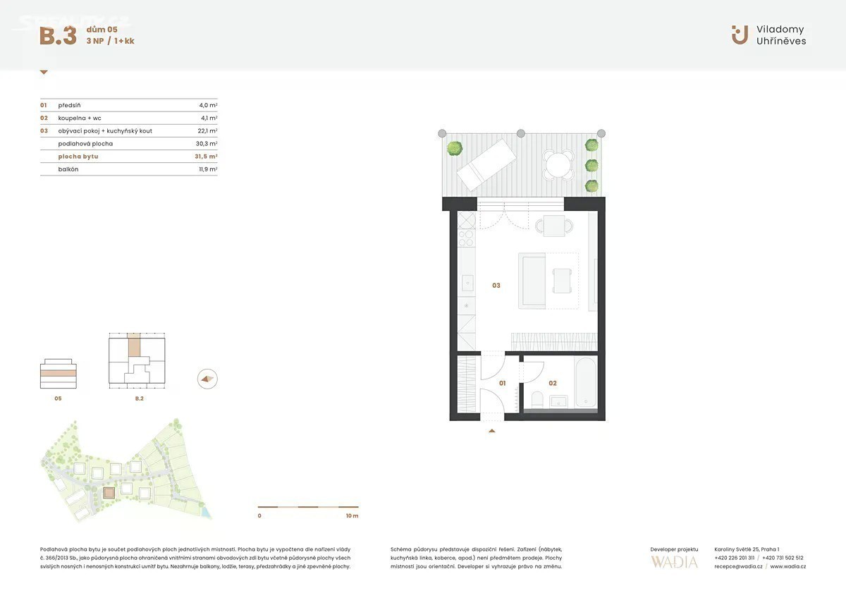 Nabízíme k prodeji byt s dispozicí 1+kk (31,5 m2), balkónem (12,1 m2) ve 4. nadzemním podlaží budovy s průkazem energetické náročnosti PENB A - mimořádně úsporná. V zeleni mírného jižního svahu vzniká čtvrť čítající 10 komorních bytových domů a 15 parcel pro individuální výstavbu rodinných domů. Důraz na precizní zpracování a promyšlený architektonický koncept činí z Viladomů Uhříněves výjimečnou příležitost pro náročné zájemce o kvalitní bydlení za atraktivní cenu. Hlavními benefity projektu jsou: Fotovoltaické elektrárny na střechách budov Tepelná čerpadla k vytápění a ohřevu vody Rekuperace vzduchu s individuálními jednotkami v každé obytné místnosti Předokenní žaluzie poskytující efektivní exteriérové stínění na všech oknech Podlahové vytápění s lepenou vinylovou podlahou Výška stropu obytných místností 2,75 m Hloubka balkónů 2,2 m Viladomy Uhříněves přinášejí nový standard bydlení, spojují komfort městského života s klidem přírody. Kontaktujte nás a informujte se o dalších přednostech našeho projektu. Parkovací stání a sklep nejsou zahrnuty v ceně bytu.