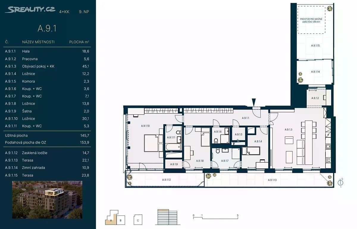 !Nově zimní zahrada v ceně! Exkluzivní bydlení s výhledem na Pražský hrad! Právě dokončený rezidenční projekt v samém srdci Břevnova spustil prodej těch nejatraktivnějších jednotek. Právě na této adrese najdete jedinečné spojení moderní architektury, špičkového designu a výjimečné lokality v prestižní rezidenční čtvrti Prahy 6. Rádi bychom Vám představili limitovaný počet luxusních penthousů, kde byl kladen důraz na maximální soukromí, komfort a výhledy, které berou dech. Tento konkrétní byt umístěný v 9.NP o dispozici 4+kk a velikosti 146 m2 se zasklenou lodžií 15 m2, terasou 22 m2, zimní zahradou 11 m2 a terasou 24 m2 disponuje vstupní halou 19 m2, obývacím pokojem s kuchyní 45 m2, hlavní ložnicí 30 m2 s vlastní koupelnou 5 m2, dalšími dvěma ložnicemi 12 m2 a 14 m2, dalšími dvěma koupelnami s WC, pracovnou 6 m2, komorou a šatnou. Všechny obytné místnosti mají přímý vstup na terasy. Velkorysý venkovní prostor nabízí místo pro umístění vířivky. Byt se prodává ve stavu shell&core a je připraven k dokončení na přání zákazníka. Každý penthouse je navržen jako nadčasové a vzdušné bydlení s přímým vstupem na prostorné terasy, vysokými stropy, velkoformátovými okny, klimatizací, předokenními žaluziemi a inteligentními technologiemi. Interiéry umožňují individuální řešení podle přání klienta, s důrazem na kvalitu materiálů a řemeslné zpracování. Projekt se nachází v klidné a zelené lokalitě s vynikající dostupností do centra města, v blízkosti parků (např. Kajetánka, Ladronka, Obora Hvězda), škol, obchodů i mezinárodního letiště. Rodiny jistě ocení nedaleké vyhledávané koupaliště Petynka. Téměř každého pak uspokojí množství obchodů a služeb na Bělohorské ulici. Samozřejmostí v projektu jsou podzemní garáže, sklepy i reprezentativní společné prostory. Přimo v sousedství je Kajetánská kaple, dětské i workoutové hřiště. Klíčové vlastnosti: Panoramatické výhledy na Prahu Exkluzivní střešní terasy Možnost úprav na míru Nadstandardní materiály a technologie Bezpečnost, soukromí a reprezentativní prostředí Penthousy Břevnov nejsou jen místem k bydlení - jsou životním stylem pro ty, kdo hledají výjimečnost. Vřele doporučujeme prohlídku!