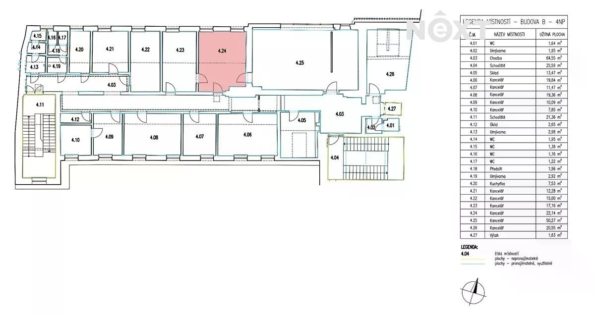 Nabízíme k pronájmu kancelář ve třetím patře administrativní budovy (B) v Praze 1 - Nové Město. Jedná se o prostor č. 4.24 (viz. plánek). Celková výměra v nájmu je 30,95 m2 (kancelář 22,14 m2 + společné prostory 8,81 m2). Budova se nachází na prestižní adrese v centru, nedaleko obchodního centra Palladium. Místo je dobře obslužné veřejnou dopravou, v blízkosti stanice metra „B“ Náměstí Republiky. V okolí velká nabídka služeb. Pro více informací volejte makléřku. Pro komunikaci uvádějte evidenční číslo zakázky N107502.