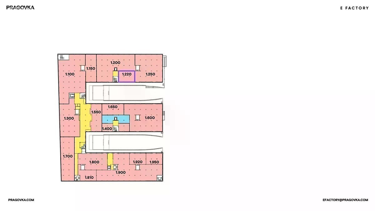 Pro obchodní jednotky je k dispozici až 3.500m2 nabízející jednotky od 72m2. Areál bývalé továrny Pragovka nabízí zrekonstruované kancelářské prostory k pronájmu v historickém industriálním centru městské části Praha 9 - Vysočany. Rozsáhlá budova E Factory je od počátku středobodem celého projektu a dvaadvacetihektarového areálu Pragovky. Na více než 27 000 m2 nabízí efektivní propojení ryzí industriální architektury s velkorysým prostorem nejen pro kanceláře a sdílená pracovní místa, ale stejně tak pro kulturní, vzdělávací a sportovní instituce, galerie, obchody, kavárny a restaurace. Budova E byla postavena v letech 1931-1934 a působila jako ústřední skladiště pošty. Její architektonické řešení do tvaru písmene E je dílem českého architekta Josefa Kalouse. Od roku 2003 je budova památkově chráněna. Projekt rekonstrukce památkově chráněné budovy E Factory byla svěřena renomované architektonické a inženýrské kanceláři TaK Architects, která má za sebou oceňované realizace u celé řady historických objektů z různých období.