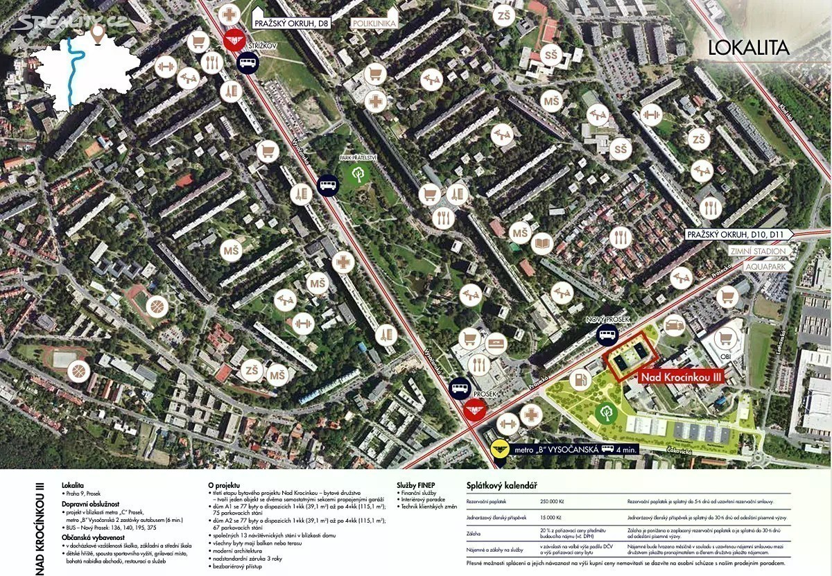 Nabízíme k prodeji byt o dispozici 4+kk v družstevním vlastnictví. V developerském projektu Krocinka III dům A2, od společnosti Finep. Dům se nachází na ulici Prosecká. Užitná plocha bytu je 106,4 m2 + 2x balkon 13,8 m2. Byt se nachází v sedmém patře domu A2 a má orientaci sever a západ. Projekt Krocinka III nabízí vynikající dostupností, pouze jednu minutu chůze od stanice metra C - Prosek. V blízkosti je kompletní občanská vybavenost, jako: poliklinika, školy, školky a obchody a supermarkety Prosecký park je ideálním pro sport a odpočinek. Byt bude dokončen koncem roku 2026. Klientské změny jsou stále možné. Skvělá investiční příležitost. Neřešíte prokazování příjmu jako u hypotéky, jelikož se jedná o družstevní byt, cenu splácíte formou nájmu. Na byt bude poskytnuta záruka 3 roky. Byt nelze v průběhu výstavby převádět do osobního vlastnictví. Celková cena je 14 600 000,- Kč Částka za převod členských práv a povinností která se hradí nyní při převodu členských práv a povinností je 4 105 130,- Kč K bytu se váže anuita ve výši 10 494 870,- Kč Anuitní splátky jsou rozvrženy na 35 let začínáte platit až po předání bytové jednotky. měsíční splátka anuity na byt je 57 715,- Kč K bytu je možné přikoupit dvě garážové stání a prostornou komoru 5,5m2 vše umístěné v 2. PP objektu A2 - Nad Krocínkou III Cena garážového stání Garáž 600 000.- odstupné 200 000,- anuita 400 000,- tis měsíční splátka anuity 2200,- Cena komory 250 000,-odstupné 105 206,- anuita 144 794,-měsíční splátka anuity 796,- Úroková sazba pro první 3-leté období fixované sazby činí 5,61 % p.a. (maximální) Délka splácení bankovního úvěru: 35 let. Pakliže dojde ke snížení sazeb dojde i ke snížení úrokové sazby na první období fixace. V případě dalších dotazů nás neváhejte kontaktovat.