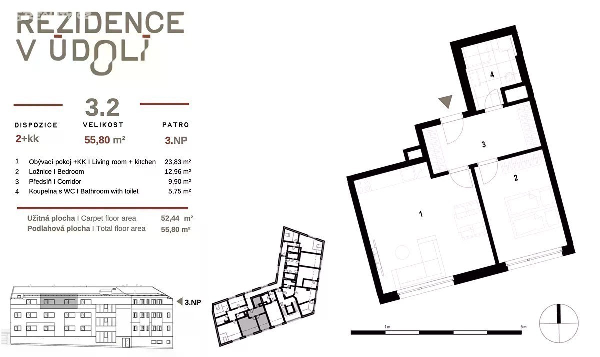 Investiční příležitost - byt 2+kk (55,8 m2) v projektu Rezidence v Údolí, Praha 9 Cena: 7 557 882 Kč | Očekávaný výnos: až 4,0 % ročně Nabízíme k prodeji investiční jednotku o dispozici 2+kk a podlahové ploše 55,8 m2 v novém developerském projektu Rezidence v Údolí. Byt má užitnou plochu 52,44 m2 a je prakticky řešen pro nájemní bydlení. Obývací pokoj s kuchyňským koutem o velikosti 23,83 m2 tvoří hlavní obytnou zónu. Na něj navazuje samostatná ložnice o výměře 12,96 m2, která zajišťuje dostatek soukromí. Předsíň (9,90 m2) nabízí dostatek úložného prostoru a propojuje všechny části bytu. Koupelna s toaletou (5,75 m2) je komfortně řešena pro každodenní užívání. - Odhadovaný měsíční nájem: 25 333 Kč - Roční výnos z pronájmu: až 4,0 % - Cena za m2 v lokalitě: cca 454 Kč / m2 (novostavby Praha 9) - Sklepní kóje v ceně, parkovací stání za příplatek Jednotka je navržena s důrazem na funkčnost a atraktivitu pro nájemce: - nadstandardní vinylové podlahy - kvalitní sanitární vybavení - velkoformátová okna s trojskly - efektivní vytápění s termostatickými hlavicemi Výhodou projektu je moderní provedení, vysoká poptávka po nájemním bydlení v této části Prahy a předpoklad stabilní obsazenosti s nízkou fluktuací nájemníků. Vhodné pro investory, kteří hledají kombinaci zhodnocení a stabilního výnosu z pronájmu.