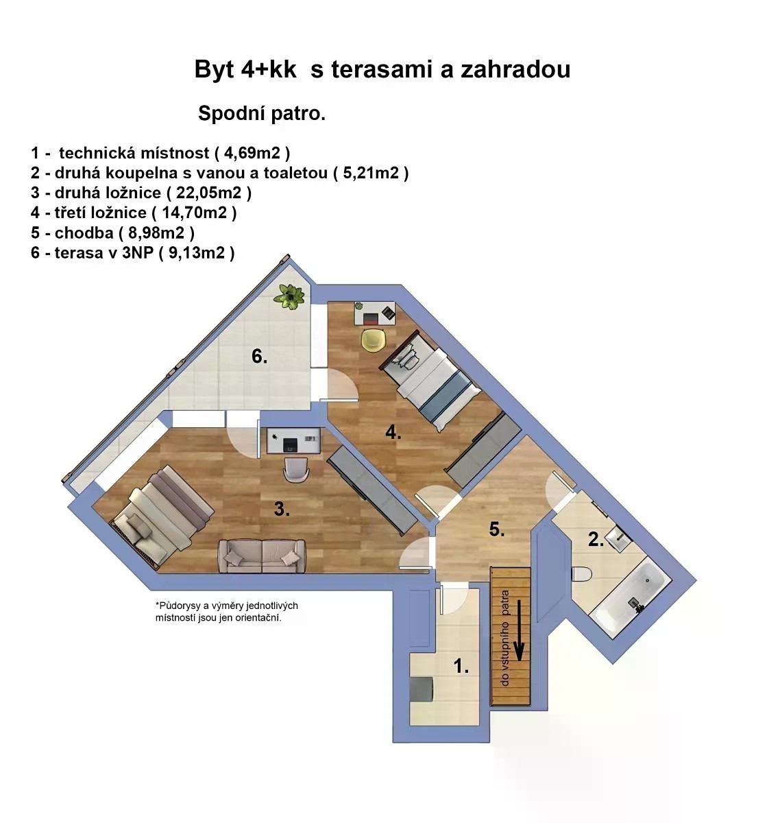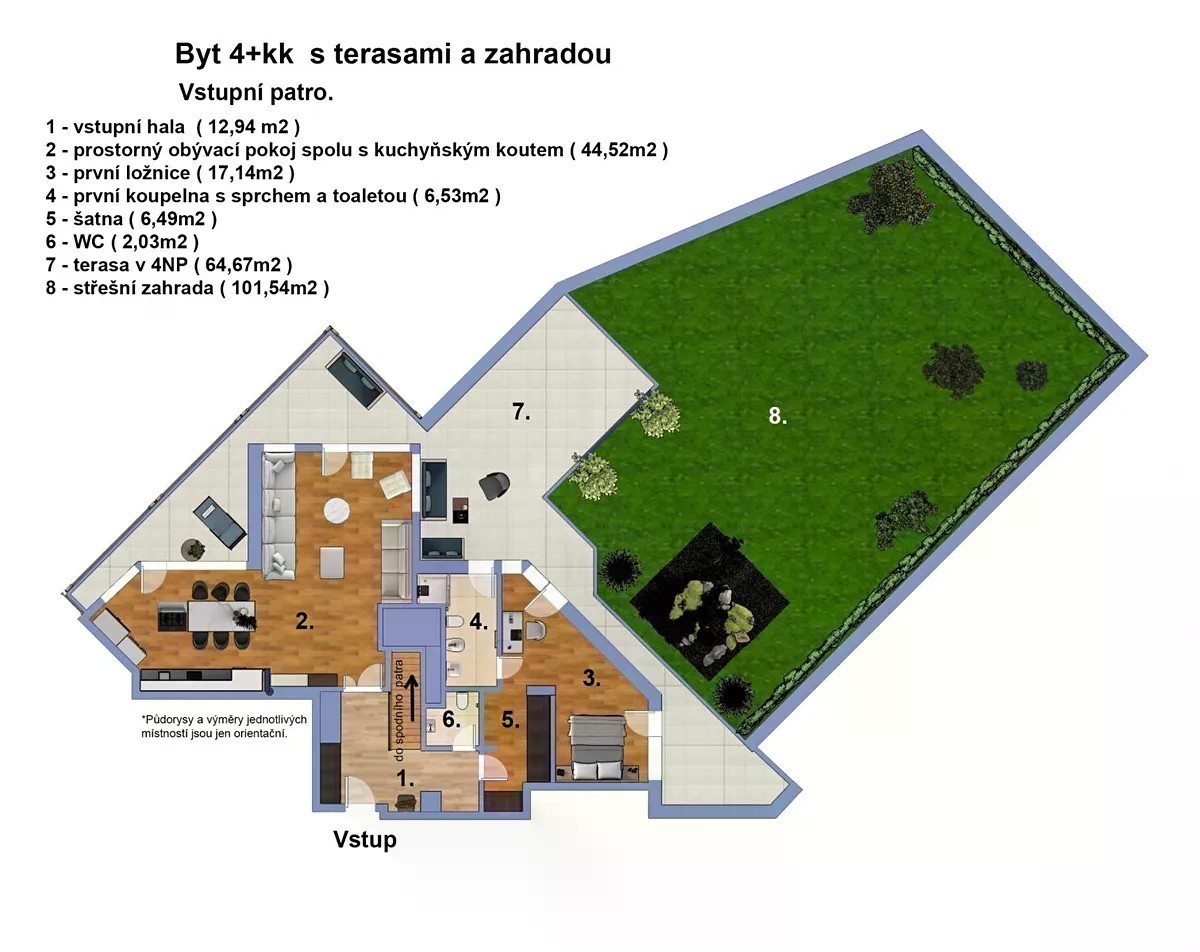 Nabízíme k prodeji hezký, světlý mezonetový byt dispozice 4+kk, s velkou střešní zahradou spolu s alpskou skalkou a vodotryskem včetně prostorných teras v rezidenci Central Park Praha, s vlastním soukromým parkem o rozloze 15 000 m2, s dětským a basketbalovým hřištěm, restaurací s možností donáškové služby objednaných jídel až do bytu, nepřetržitou recepcí, non-stop bezpečnostní ostrahou objektu včetně kamerového systému a dalšími vybranými službami pro rezidenty. Veškeré vstupy do objektů komplexu, podzemních garáží i vnitřního parku jsou zpřístupněné výhradně pro majitelé prostřednictvím bezpečnostních čipů. Jedná se o prostorný, luxusní byt s dostatkem úložných prostorů ve 4/3 podlaží, nacházející se v kondominiumu Central Park Praha od architektonické kanceláře A69, který v roce 2010 získal národní cenu za architekturu Grand Prix. Vnitřní dispozice bytu nabízí toto uspořádání: - vstupní halu ( 12,94 m2 ) - prostorný obývací pokoj spolu s kuchyňským koutem ( 44,52m2 ) - první ložnici ( 17,14m2 ) - první koupelnu s vanou a toaletou ( 6,53m2 ) - šatnu ( 6,49m2 ) - WC ( 2,03m2 ) - chodbu ( 8,98m2 ) - technickou místnost ( 4,69m2 ) - druhou koupelnu se sprchovým koutem a toaletou - druhou ložnici ( 22,05m2 ) - třetí ložnici ( 14,70m2 ) Součástí bytu dále: - terasa v 3NP ( 9,13m2 ) - terasa v 4NP ( 64,67m2 ) - střešní zahrada ( 101,54m2 ) - sklep ( 12,05m2 ) K bytu rovněž náleží dvě parkovací stání v podzemním podlaží. Vybavení bytu disponuje nadstandardním provedením ( keramické obklady, velkoformátová dlažba, sanita, dřevěné podlahy, interiérové dveře, okna s tepelně izolačními trojskly, v koupelnách podlahové vytápění s možností regulace, bezpečnostní vstupní dveře ). Celá bytová jednotka s východní orientací poskytuje dostatek denního světla díky velkým francouzským oknům, z každého pokoje je možný přístup na terasu. Součástí prodeje je rovněž plně vybavená nová kuchyň, tj. el. sporák, mikrovlnná trouba, indukční varná deska, lednička s mrazákem, myčka a veškerý interiérový nábytek. V okolí se nachází kompletní občanská vybavenost, mnoho restaurací, pošta, poliklinika, mateřské i základní školy, gymnázia, bazény, sportovní centrum s posilovnou a tenisovými kurty, bowling, nákupní centrum Flora, kina a kluby, park Parukářka aj. Milovníky kultury nadchne škála divadel a kulturních akcí v bezprostředním okolí. Lokalita nabízí výbornou dopravní dostupnost jak osobním vozidlem, tak pomocí MHD - tramvajová zastávka Nákladové nádraží Žižkov se nachází v pěší vzdálenosti 150 m od domu, 8 minut autem trvá cesta do centra města, stanice metra též v dosahu několika minut. Koupi bytové jednotky v osobním vlastnictví lze financovat prostřednictvím hypotéčního úvěru, který Vám pomůžeme vyřídit za nejvýhodnějších tržních podmínek. Jedinečná možnost luxusního bydlení v širším centru Prahy. Více informací na dotaz.