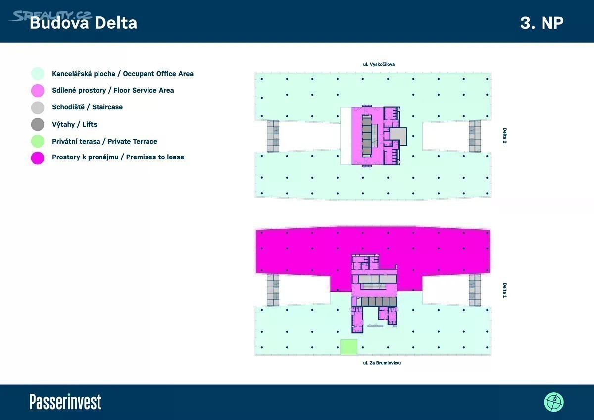 Nabízíme na pronájem prvotřídní kancelářské prostory o celkové ploše 1 321 m2 ve 3. nadzemním podlaží administrativní budovy Delta, Vyskočilova 1561/4a, Praha 4 - Michle. Prostory k dispozici ihned jsou vybavené stávajícím fit outem, úpravy možné dle dohody. Další prostory k pronájmu v této budově o ploše 599 m2 ve standardu open plan se nacházejí na 4. NP a další o stejné ploše 599 m2 ve stávajícím fit outu jsou ihned k dispozici ve 3. NP. Delta, která je součástí lokality Brumlovka, má celkovou pronajímatelnou plochu 40 800 m2 v 8 nadzemních podlažích a 880 parkovacích míst v 5 podzemních podlažích. Nachází se v místě ohraničeném hlavní třídou Vyskočilova a ulicemi Václava Sedláčka a Za Brumlovkou. Deltu tvoří dvě samostatné budovy s velmi efektivním půdorysem ve tvaru dvou písmen H. Delta je navržena s maximálním ohledem na životní prostředí, k dispozici nájemcům jsou prostorné střešní terasy s bohatou zelení a relaxačními zónami. Západní část budovy lemuje zelený pás s umělým říčním korytem, na jižní stranu objektu volně navazuje Park Brumlovka. V přízemí budovy je restaurace a veřejná kantýna. Delta má vynikající dopravní dostupnost: autobusová zastávka přímo před budovou (dvě zastávky ke stanicím linky trasy C - Budějovická a Kačerov), přímé napojení na Pražský okruh a dálnici D1. Široká nabídka obchodů a služeb v lokalitě Brumlovky (restaurace, kavárny, veřejné kantýny, supermarket Albert, zdravotnická zařízení, fitness a wellnes Balance Club Brumlovka, čistírna…), parky pro odpočinek a relaxaci a Náměstí Brumlovka s vodními prvky a posezením, kde se konají pravidelně trhy a společenské a kulturní akce. K hlavním nájemcům budovy Delta patří společnosti Hewlett Packard, HP INc. a Microsoft.