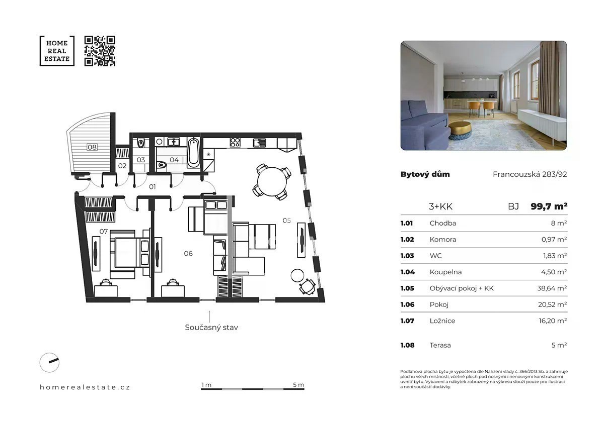 Společnost Home Real Estate si dovoluje nabídnout k prodeji nadstandardně zařízený byt po kompletní rekonstrukci o výměře 94,7 m² + terasa cca 5 m² ve 4. patře rekonstruované a zateplené budovy s výtahem na lukrativní adrese na rozhraní Královských Vinohrad a Vršovic. Zpracování bytu splňuje požadavky nejnáročnějších klientů a nabízí vysoký standard a komfort moderního bydlení. Vybavení: - rekonstrukce byla provedena s důrazem na detail a za účasti designérské práce, - byt disponuje dostatečným množstvím úložných prostor, - veškerý nábytek dle fotodokumentace včetně osvětlení je v ceně. Byt má skvělou dispozici a sestává z: - přiměřeně velké vstupní chodby, která nabízí vstup do všech obytných místností včetně terasy, orientované do klidného vnitrobloku, - prostorné ložnice č. 1 orientované do klidné ulice U Staré Sokolovny, - prostorné ložnice č. 2 orientované rovněž do klidné ulice U Staré Sokolovny, která je aktuálně využívána jako dětský pokoj, - velké obytné místnosti, ve které se nachází kuchyňská linka na míru plně vybavená spotřebiči. Jídelní část zdobí jídelní stůl, který pohodlně usadí čtyři až šest hostů. Dále v obývacím pokoji najdete gauč a knihovnu, - koupelny, která nabízí krásnou vanu se sprchovým setem, umyvadlo se skříňkou, zrcadlo s LED osvětlením, další WC a pračku se sušičkou, - technické místnosti (úklidové potřeby, plynový kondenzační kotel), - samostatného WC s umyvadlem. Topení - chlazení: - plynový kondenzační kotel s radiátory a prostorovým termostatem, - obě ložnice jsou vybaveny klimatizačními jednotkami. Shrnutí: 2× WC, 1× technická místnost, 2× samostatné ložnice, 1× velký obývací pokoj, 1× koupelna, 1× terasa. Potenciál: Lze poměrně snadno - díky zajímavé dispozici, velkému počtu oken a velkorysé ploše bytu - vytvořit 4+kk pomocí jedné příčky a interiérových dveří. Tím si zajistíte další neprůchozí pokoj s orientací do ulice Francouzská a U Staré Sokolovny. Nově vzniklá místnost může být využita jako dětský pokoj, pracovna, hostinský pokoj nebo třeba umělecká dílna. Atraktivní lokalita na pomezí vyhledávaných rezidenčních čtvrtí Vinohrady a Vršovice s rychlým spojením do centra a s plnou občanskou vybaveností. Vzrostlé stromy v ulicích, skvělé gastro podniky a oblíbené Heroldovy sady. Dům se nachází pár minut chůze od zastávky Vršovické náměstí. Budova se nachází blízko tramvajových zastávek Krymská a Ruská, což zajišťuje vynikající dopravní dostupnost ve všech směrech díky několika hlavním tramvajovým linkám. Náměstí Míru a metro A jsou dosažitelné za 5 minut, I. P. Pavlova a metro C za 10 minut a oblíbená vltavská náplavka za 15 minut. Lokalita Vršovic navíc nabízí snadnou pěší dostupnost do Vinohrad, kde najdete mnoho oblíbených podniků a obchodů, vzdálených jen několik minut chůze. Klíčové autobusové linky a železniční doprava jsou také v blízkosti, u dopravního uzlu Slavia - Nádraží Eden, dostupného pěšky za pár minut. Celková cena: 18.990.000,- Kč vč. právního servisu a provize RK. K nastěhování: ihned. Pro více informací nás prosím kontaktujte nebo vyplňte formulář níže.