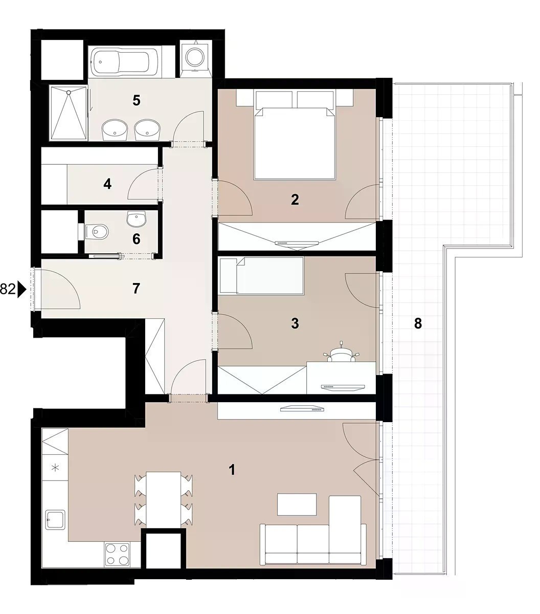 Nabízíme k prodeji byt 184-08-082 s dispozicí 3+kk (76,4 m2), terasou (21,7 m2), přiřazeným sklepem a garážovým stáním v novém projektu Viladomy Střížkov. Viladomy Střížkov jsou komorní rezidenční projekt navazující na nezastavitelnou zeleň v klidné části Prahy 8, jen kousek od stanic metra C - Ládví a Střížkov. Jde o pokračující etapu velmi oblíbeného a úspěšného projektu Viladomy Roudnická. Kromě nových moderních bytů a bohaté zeleně zde vznikne i prostor pro kavárnu, obchod nebo provozovnu služeb. V okolí se nachází široká občanská vybavenost, včetně školek a škol, obchodů a služeb. Lokalita nabízí příjemné prostředí pro relaxaci i rodinné aktivity a široké možnosti sportovního vyžití. Parkovací stání a sklepy nejsou zahrnuty v ceně z důvodu snadnějšího a přehlednějšího porovnání napříč nabídkou na trhu nového bydlení.