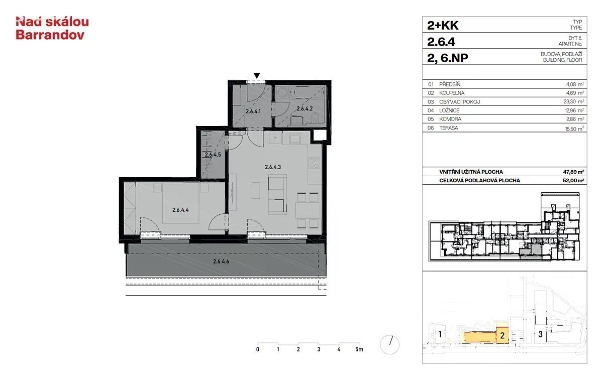 Prodej bytu 2+kk, 52 m² + terasa 15,5 m² - Praha 5, Barrandov Nabízíme k prodeji moderní byt o dispozici 2+kk a celkové užitné ploše 52 m², situovaný v 6. nadzemním podlaží novostavby ve vyhledávané lokalitě Praha 5 - Barrandov. Byt je orientován na jih, což zajišťuje dostatek denního světla po celý den. Součástí bytu je prostorná terasa o velikosti 15,5 m², ideální pro relaxaci, posezení s přáteli nebo jako privátní venkovní zóna s příjemným výhledem. Celý projekt je navržen s důrazem na komfort, funkčnost a moderní architekturu. Byt je aktuálně ve výstavbě, dokončení a možnost nastěhování se plánuje na 2Q 2026. Hlavní výhody: dispozice 2+kk 52 m² vnitřní plochy terasa 15,5 m² jižní orientace podlaží s výtahem osobní vlastnictví klidné a atraktivní prostředí s výbornou dostupností Nutnost přikoupení garážového stání za 540 000 Kč. Tato nemovitost představuje výbornou příležitost jak pro vlastní bydlení, tak jako investici v rozvíjející se části Prahy s veškerou občanskou vybaveností. V případě zájmu o více informací nebo domluvení osobní schůzky nás neváhejte kontaktovat. Rádi vám poskytneme veškeré podklady a zodpovíme vaše dotazy.