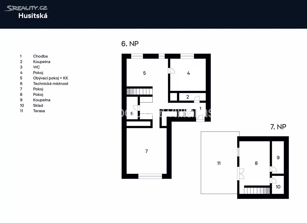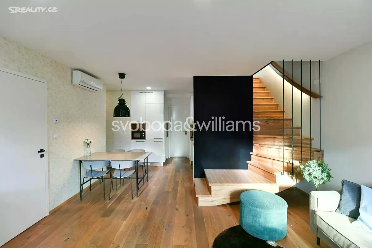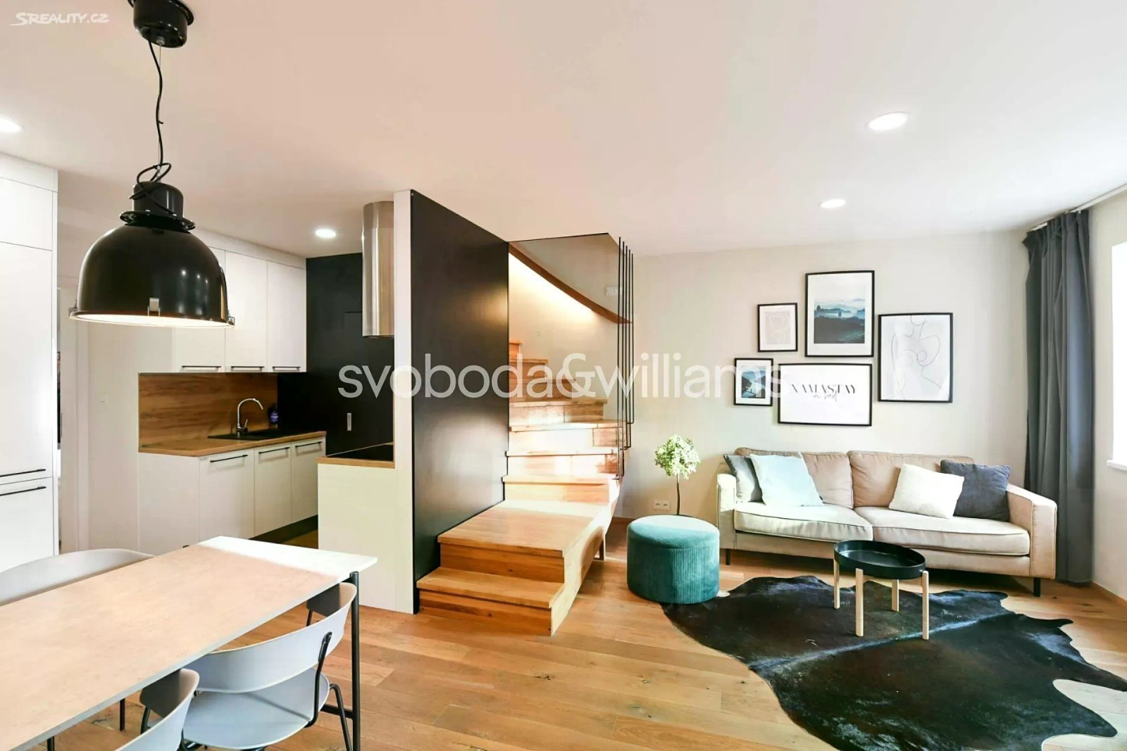 Klimatizovaný, kompletně zařízený mezonetový byt s prostornou terasou orientovanou na jih do vnitrobloku se nachází ve zrekonstruovaném bytovém domě s výtahem. Cihlová budova stojí v širším centru metropole na rozhraní Žižkova, Karlína a Nového Města. Ve vstupní úrovni (6. NP) je umístěn obývací pokoj s kuchyní, 2 ložnice, koupelna, samostatná toaleta, technická místnost a předsíň. Horní úroveň obsahuje ložnici, koupelnu a úložný prostor. Z ložnice vede vstup na slunnou terasu. Téměř stometrový byt vznikl půdní vestavbou v r. 2018, rekonstrukce a úprava do současné podoby proběhla v r. 2020. Okna a podlahy jsou dřevěné, pokoje mají klimatizační jednotky, vytápění zajišťuje plynový kotel. Kupní cena zahrnuje veškeré interiérové vybavení. Dům je pěkně udržovaný, výtah vede do mezipater. V bezprostřední blízkosti funguje spousta kaváren, restaurací, bister, klubů a obchodů, blízko je také divadlo Ponec nebo Žižkovské divadlo Járy Cimrmana, v pěším dosahu jsou i vzdělávací zařízení včetně ScioŠkoly. U domu je autobusová zastávka, v pěším dosahu i přestupní stanice metra, tramvajová zastávka a autobusové nádraží Florenc. Lokalitu zpříjemňuje rozlehlý park na Vítkově, kterým vedou stezky pro pěší, cyklisty i inline bruslaře. Podlahová plocha 91,8 m2, terasa 17,9 m2.