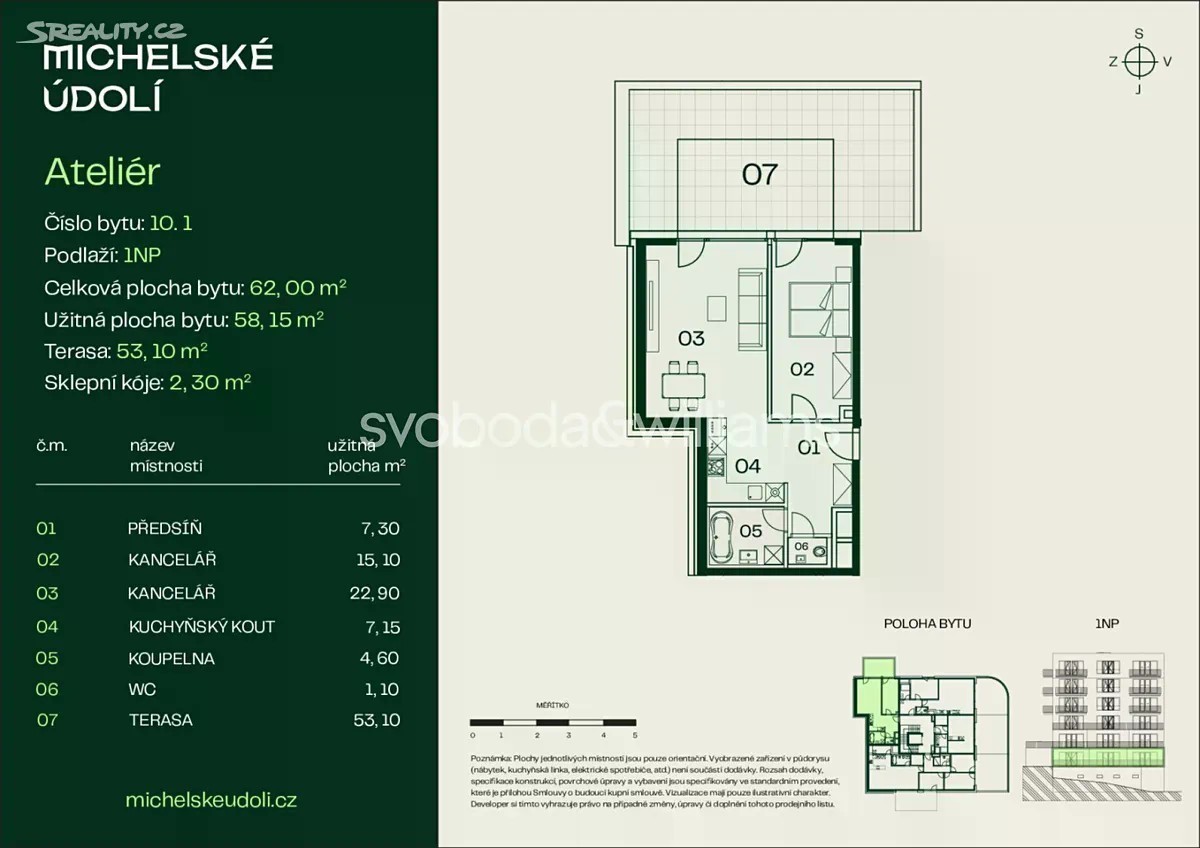 Nový ateliér s více než padesátimetrovou terasou bude součástí bytového domu s elegantní cihličkovou fasádou a parkováním, který právě vzniká 270m od parku Jezerka a 5 minut chůze od nejbližší zastávky tramvaje. Klidné místo plné zeleně na Praze 4 je na rozhraní Michle, Nuslí a Pankráce, pouhých 12 minut cesty MHD od centra města. Dokončení je naplánováno na Q2/2026. Plocha ateliéru v 1. podlaží (4,9 m nad úrovní chodníku) bude rozdělena na obývací pokoj s přípravou na kuchyňský kout, ložnici, koupelnu, samostatnou toaletu a předsíň. Z obou pokojů půjde vstoupit na prostornou severně orientovanou terasu. K vysokému standardu patří třívrstvé dřevěné podlahy Boen, velkoplošná okna s elektricky ovládanými žaluziemi, sanita Villeroy & Boch, baterie Hansgrohe v matné černé, velkoformátové obklady a dlažba, protipožární bezpečnostní vstupní dveře, interiérové dveře bezfalcové s magnetickými zámky, teplovodní podlahové vytápění, rekuperace a příprava pro klimatizaci. Součástí kupní ceny je sklep. Garážové stání je možné přikoupit. Rezidenční projekt Michelské údolí vzniká v klidné a zelené části Prahy 4, v boční jednosměrné ulici. Okolí je plné restaurací a obchodů, jen pár kroků vede na autobusovou a tramvajovou zastávku. Dostupnost v blízké budoucnosti ještě zvýší nová trasa metra D. Autem se dá rychle napojit na magistrálu. Oblast nabízí široké možnosti sportu a procházek v zeleni, blízko je park Jezerka nebo Tyršův vrch, přímo okolo rezidence vede cyklostezka. Podlahová plocha 62 m2, terasa 53,1 m2, sklep 2,3 m2.