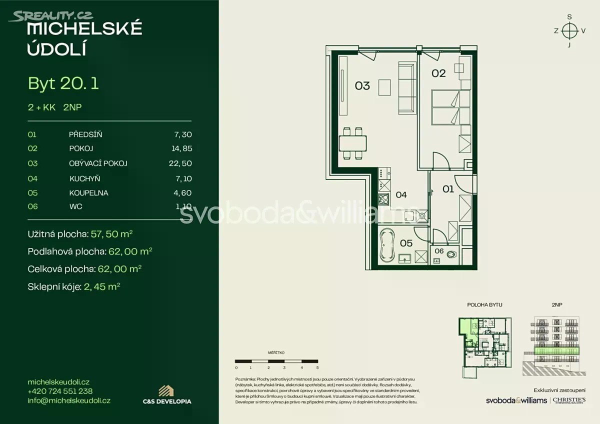 Nadstandardně dokončený byt bude součástí bytového domu s elegantní cihličkovou fasádou a parkováním, který právě vzniká 270m od parku Jezerka a 5 minut chůze od nejbližší zastávky tramvaje. Klidné místo plné zeleně na Praze 4 je na rozhraní Michle, Nuslí a Pankráce, pouhých 12 minut cesty MHD od centra města. Dokončení je naplánováno na Q2/2026. Plocha bytu ve 2. podlaží bude rozdělena na obývací pokoj, ložnici, koupelnu, samostatnou toaletu a zádveří. U obývacího pokoje bude příprava na kuchyni. K vysokému standardu patří třívrstvé dřevěné podlahy Boen, velkoplošná okna s elektricky ovládanými žaluziemi, sanita Villeroy & Boch, baterie Hansgrohe v matné černé, velkoformátové obklady a dlažba, protipožární bezpečnostní vstupní dveře, interiérové dveře bezfalcové s magnetickými zámky, teplovodní podlahové vytápění, rekuperace a příprava pro klimatizaci. Součástí kupní ceny je sklep. Garážové stání je možné přikoupit. Rezidenční projekt Michelské údolí vzniká v klidné a zelené části Prahy 4, v boční jednosměrné ulici. Okolí je plné restaurací a obchodů, jen pár kroků vede na autobusovou a tramvajovou zastávku. Dostupnost v blízké budoucnosti ještě zvýší nová trasa metra D. Autem se dá rychle napojit na magistrálu. Oblast nabízí široké možnosti sportu a procházek v zeleni, blízko je park Jezerka nebo Tyršův vrch, přímo okolo rezidence vede cyklostezka. Podlahová plocha 62 m2, sklep 2,45 m2.