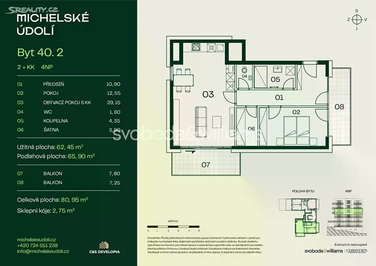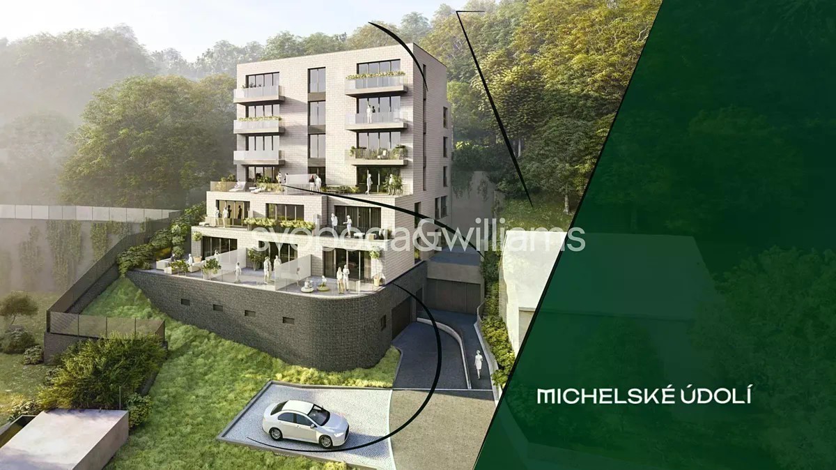 Nadstandardně dokončený byt se dvěma balkony se bude nacházet v právě vznikajícím rezidenčním projektu Michelské údolí na pomezí Michle, Nuslí a Pankráce, 5 minut chůze od zastávky tramvaje a 270m od parku Jezerka. Dokončení je naplánováno na Q2/2026. Plocha bytu v 5. podlaží bude rozdělena na obývací pokoj s jižně orientovaným balkonem, ložnici, koupelnu, samostatnou toaletu, šatnu a zádveří. U obývacího pokoje bude příprava na kuchyni. Z ložnice a zádveří půjde vstoupit na východně orientovaný balkon. K vysokému standardu patří třívrstvé dřevěné podlahy Boen, velkoplošná okna s elektricky ovládanými žaluziemi, sanita Villeroy & Boch, baterie Hansgrohe v matné černé, velkoformátové obklady a dlažba, protipožární bezpečnostní vstupní dveře, interiérové dveře bezfalcové s magnetickými zámky, teplovodní podlahové vytápění, rekuperace a příprava pro klimatizaci. Součástí kupní ceny je sklep. Garážové stání je možné přikoupit. Rezidenční projekt Michelské údolí vzniká v klidné a zelené části Prahy 4, v boční jednosměrné ulici. Okolí je plné restaurací a obchodů, jen pár kroků vede na autobusovou a tramvajovou zastávku. Dostupnost v blízké budoucnosti ještě zvýší nová trasa metra D. Autem se dá rychle napojit na magistrálu. Oblast nabízí široké možnosti sportu a procházek v zeleni, blízko je park Jezerka nebo Tyršův vrch, přímo okolo rezidence vede cyklostezka. Podlahová plocha 62 m2, balkony 7,8 + 7,25 m2, sklep 2,3 m2.
