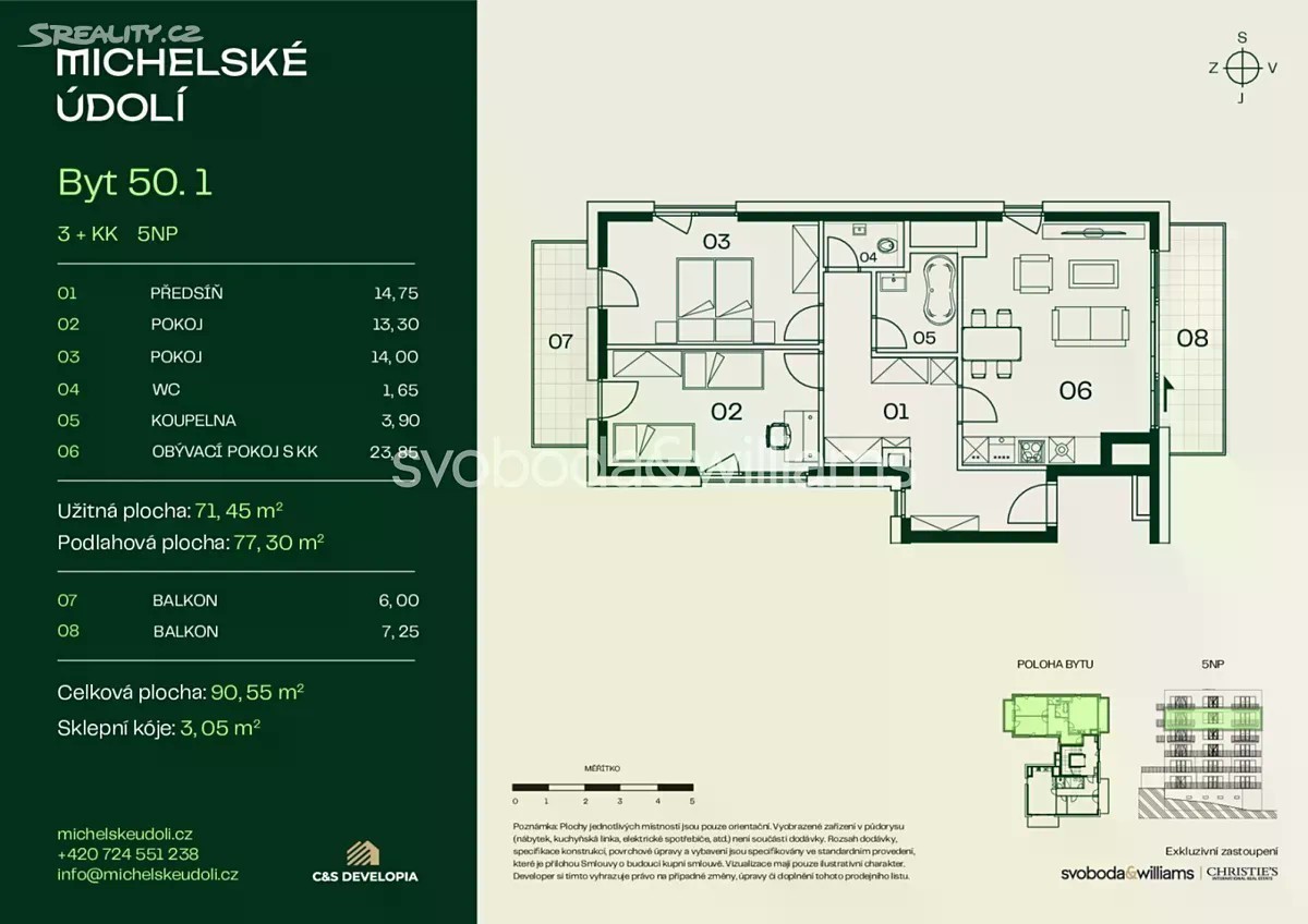 Nadstandardně dokončený byt se dvěma balkony se bude nacházet v právě vznikajícím rezidenčním projektu Michelské údolí na pomezí Michlí, Nuslí a Pankráce, 5 minut chůze od zastávky tramvaje a 270m od parku Jezerka. Dokončení je naplánováno na Q2/2026. Plocha bytu v 5. podlaží bude rozdělena na obývací pokoj s východně orientovaným balkonem, 2 ložnice, koupelnu, samostatnou toaletu a zádveří. U obývacího pokoje bude příprava na kuchyni. Z obou ložnic půjde vstoupit na západně orientovaný balkon. K vysokému standardu patří třívrstvé dřevěné podlahy Boen, velkoplošná okna s elektricky ovládanými žaluziemi, sanita Villeroy & Boch, baterie Hansgrohe v matné černé, velkoformátové obklady a dlažba, protipožární bezpečnostní vstupní dveře, interiérové dveře bezfalcové s magnetickými zámky, teplovodní podlahové vytápění, rekuperace a příprava pro klimatizaci. Součástí kupní ceny je sklep. Garážové stání je možné přikoupit. Rezidenční projekt Michelské údolí vzniká v klidné a zelené části Prahy 4, v boční jednosměrné ulici. Okolí je plné restaurací a obchodů, jen pár kroků vede na autobusovou a tramvajovou zastávku. Dostupnost v blízké budoucnosti ještě zvýší nová trasa metra D. Autem se dá rychle napojit na magistrálu. Oblast nabízí široké možnosti sportu a procházek v zeleni, blízko je park Jezerka nebo Tyršův vrch, přímo okolo rezidence vede cyklostezka. Podlahová plocha 77,3 m2, balkony 6 + 7,25 m2, sklep 3,05 m2.