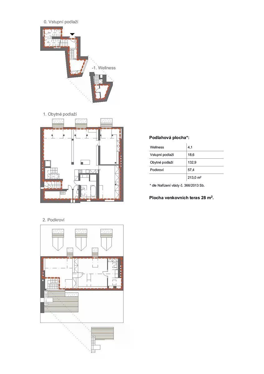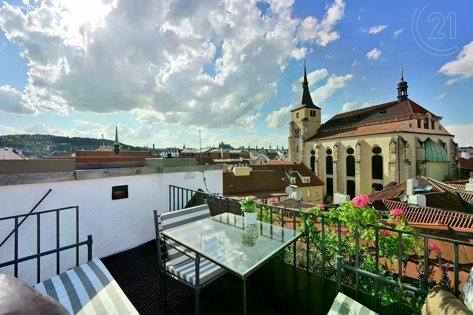 Nabízíme k prodeji výjimečný slunný mezonet 5+kk po rekonstrukci s pěti balkony a dvěma terasami o celkové ploše 241 m² (podlahová plocha 213 m² + plocha venkovních teras 28 m²). Tento unikátní byt s nádherným výhledem na Staré Město a Prahu se nachází v klidné slepé ulici, v těsné blízkosti Staroměstského náměstí, v nenápadném domě s pouhými pěti byty. Dům je skvěle udržovaný, s byty v osobním vlastnictví, po rekonstrukci s novou fasádou. Nabízí elegantní společné prostory s empírovou vstupní chodbou, upraveným malým dvorkem a společným dvojsklepem. Byt zabírá celou horní polovinu domu, která není vidět z ulice. Byl vybudován v polovině devadesátých let a nedávno prošel kompletním redesignem s použitím nejmodernějších a nejkvalitnějších materiálů. Od té doby nebyl trvale užíván, takže nenese významné stopy opotřebování a působí téměř jako nový. Většina nábytku je jeho trvalou součástí, což umožňuje okamžité užívání bez nutných úprav. Vstup do bytu je ve 2. patře domu. Předsíň je vybavena vestavěnou skříní na oblečení. Několik schůdků vede k sauně pro dvě osoby, úložnému prostoru pro saunovací potřeby a sprchovacímu koutu. Nad saunou se nachází odpočinkový prostor s prosklenou zdí do dvora, pohodlnými křesly a další velkou vestavěnou skříní. K dispozici je audio systém s reproduktory v tomto prostoru a také v sauně. Široké schodiště s oknem a zabudovanými skříňkami na boty vede do hlavního a největšího prostoru bytu otevřené obývací haly s kuchyňským koutem. Technická místnost s oknem je vybavena pračkou, plynovým kotlem Vailant a skladovacími prostory. Vedle ní je samostatné WC s oknem pro hosty a velká koupelna se dvěma okny, masážní vanou, sprchovacím koutem, umyvadlem a WC se zabudovaným bidetem. Koupelna je vybavena reproduktory z dalšího audio systému a menší televizí na zdi. Obývací pokoj má dvě francouzská okna s balkony a malou květinovou zahrádkou. V jedné části je krb obložený bílým mramorem, velké filmové plátno s projektorem na stropě, velká sedačka s křesly a barová skříňka. Kuchyňský kout je kompletně vybaven (myčka, americká lednice, vinotéka, zabudovaný kávovar) a jídelní stůl pro 68 osob. Z obývacího pokoje vedou dveře do dvou útulných ložnic, z nichž jedna má balkon a druhá velké okno do dvorku. V ložnicích jsou zabudované skříně, knižní police a televize. Druhá ložnice je momentálně využívána jako šatna. Část obývacího pokoje je otevřena až ke střeše, kde se nachází dva další pokoje. Jeden slouží jako pokoj pro hosty s vlastní koupelnou, druhý jako pracovna s balkonem a vstupem na prostornou terasu s letní sedačkou, zabudovaným kamenným stolem a vzrostlou zelení. Nad touto terasou je další terasa s panoramatickým výhledem na celou starou Prahu. Tento jedinečný byt v srdci historické Prahy, s neobyčejnou atmosférou a moderním vybavením, nabízí bezpečnou investici s velkou pravděpodobností růstu. Měsíční poplatek SVJ činí 8 055 Kč. Pro více informací a prohlídku kontaktujte naši realitní kancelář.