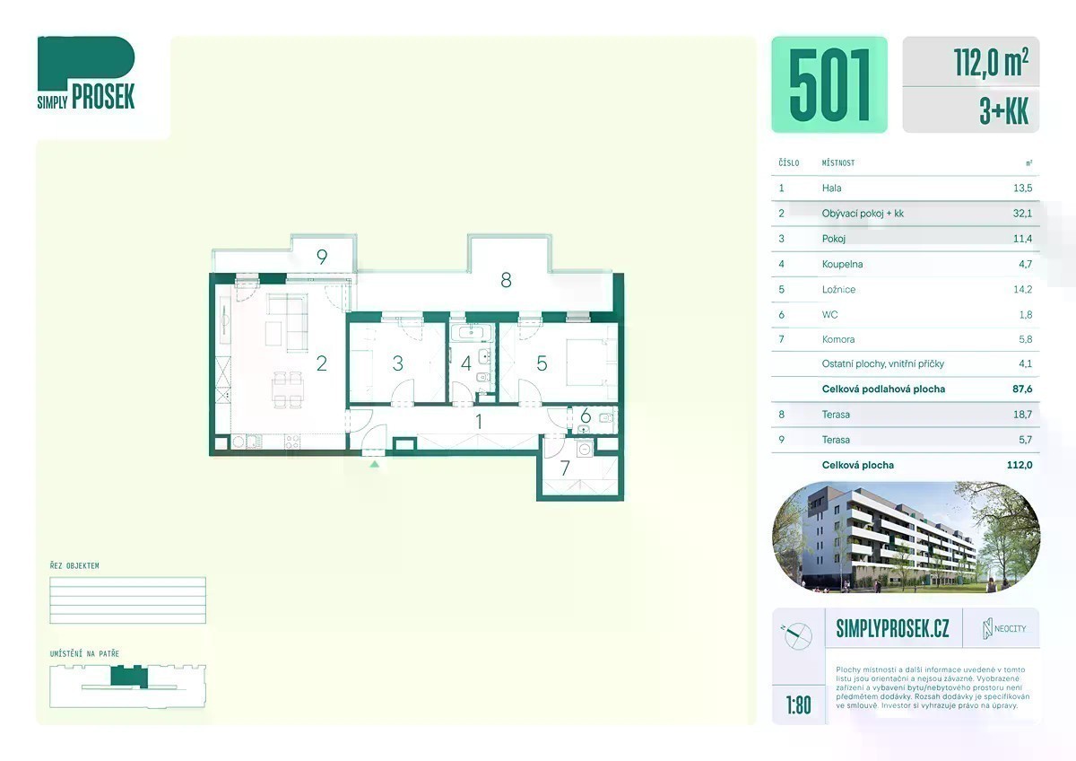 Exkluzivní nabídka bytů 3+kk přímo od developera v nově vznikajícím projektu Simply Prosek. Byt č. 501, 3+kk o předpokládané podlahově ploše 87,6 m2 s terasami o velikosti 18,7 m2 a 5,7 m2 se bude nacházet v pátém podlaží domu na adrese Bohušovická. V bytě budou použité nadstandardní materiály: vinylová podlaha, bezfalcové interiérové dveře, bezpečností vstupní dveře, v koupelně zařizovací předměty Ideal standard. V bytě bude rekuperace a podlahové topení. V rámci volitelného nadstandardu si můžete dokoupit předokenní elektrické žaluzie a videotelefon. Na střeše budou umístěny fotovoltaické panely. Vyrobená elektřina se bude využívat na spotřebu společných částí domu. K bytu si můžete dokoupit sklep a parkovací místo. Cena sklepa je od 250 000 Kč v závislosti na velikosti. Cena parkovací místa, které se bude nacházet v prvním nebo druhém podzemním podlaží je 700 000 Kč. Splátkový kalendáře je rozdělený do dvou plateb 15 % a 85 %. První splátka ve výši 15 % je splatná po podpisu Smlouvy o smlouvě budoucí. Doplatek 85 % pak po kolaudaci.